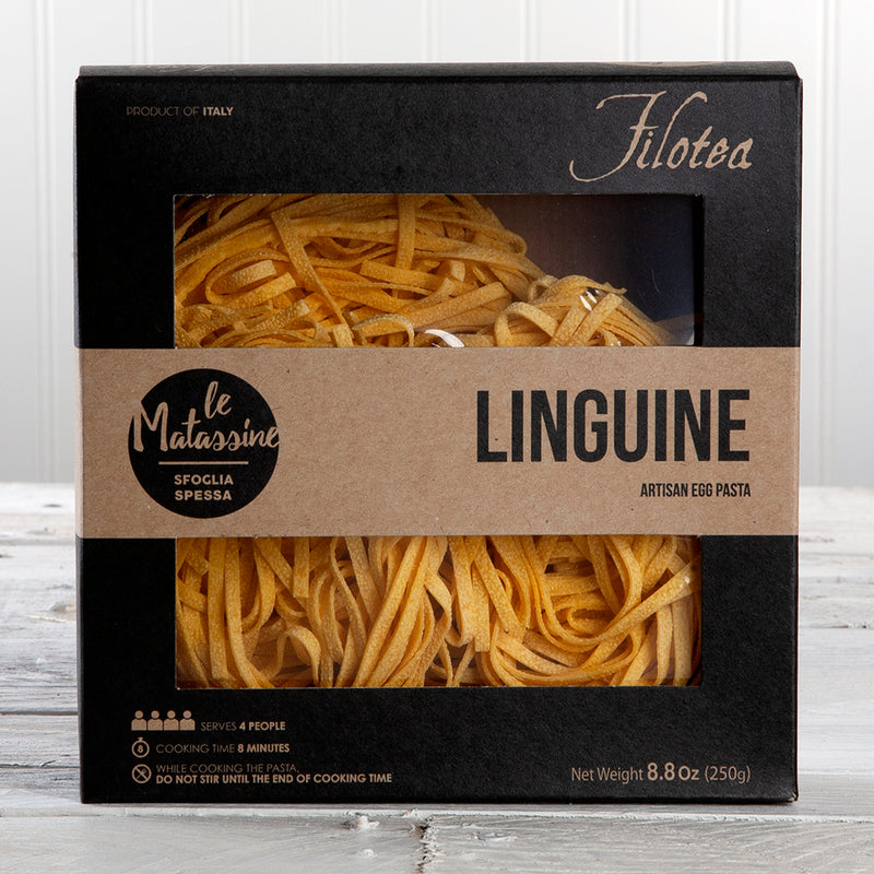 Linguine hand formed pasta nests. Filotea produces dry egg pasta using the finest raw materials; fresh eggs, durum wheat semolina flour and 00 flour, following a unique recipe and artisan preparation method. The result is an egg pasta that is reminiscent of a homemade one, traditionally prepared by grandmothers. It is light and easy to digest, while its textured surface helps to absorb the sauces, thus exalting the flavor of all the ingredients. Filotea is regarded as one of the 'Top Italian Food & Beverage Experience' by the leading Gambero Rosso guide.