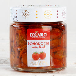 DeCarlo half-dries cherry tomatoes for a pronounced sweetness and retained freshness. Preserved in estate-grown DeCarlo extra virgin olive oil with garlic, salt and herbs, these little beauties are brilliantly simple. Enjoy them with fresh ricotta, mozzarella, shaved Parmesan, pecorino, or just about any cheese. Top a pizza, toss into pasta, add to sandwiches, or mix with fresh tomatoes in a salad.