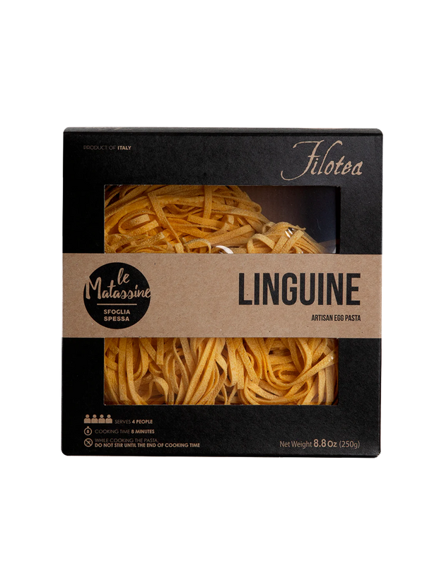 Linguine hand formed pasta nests. Filotea produces dry egg pasta using the finest raw materials; fresh eggs, durum wheat semolina flour and 00 flour, following a unique recipe and artisan preparation method. The result is an egg pasta that is reminiscent of a homemade one, traditionally prepared by grandmothers. It is light and easy to digest, while its textured surface helps to absorb the sauces, thus exalting the flavor of all the ingredients. Filotea is regarded as one of the 'Top Italian Food & Beverage Experience' by the leading Gambero Rosso guide.