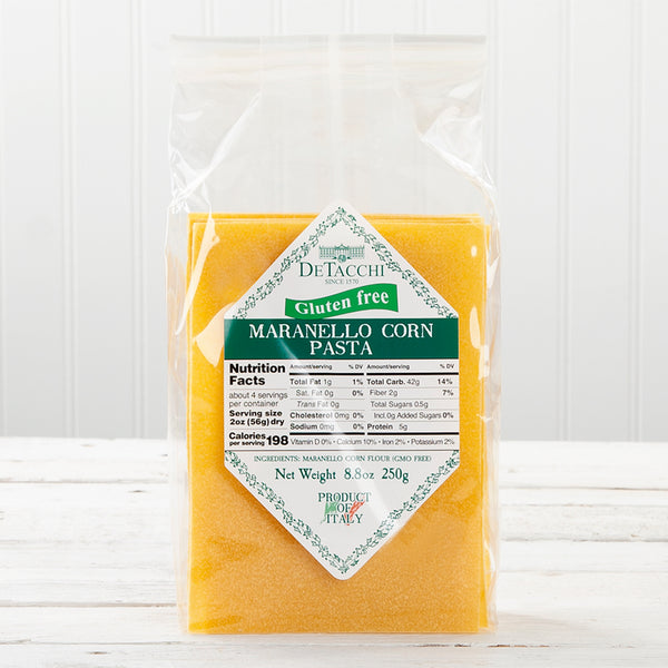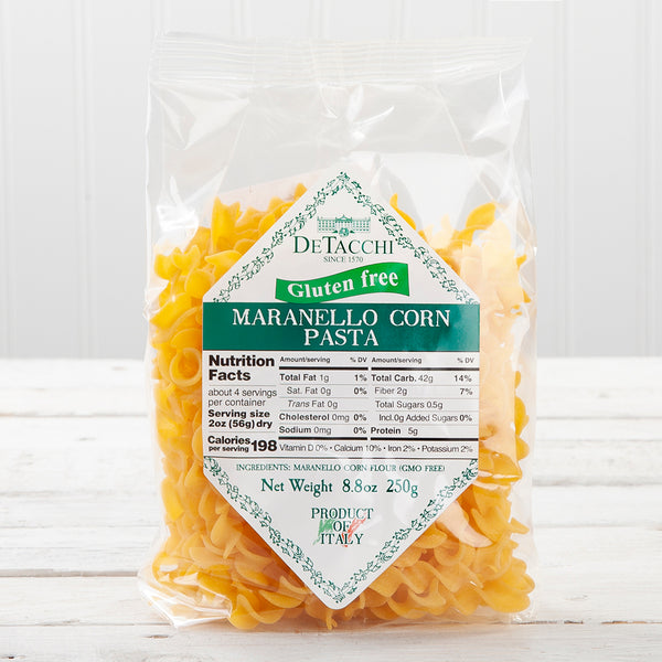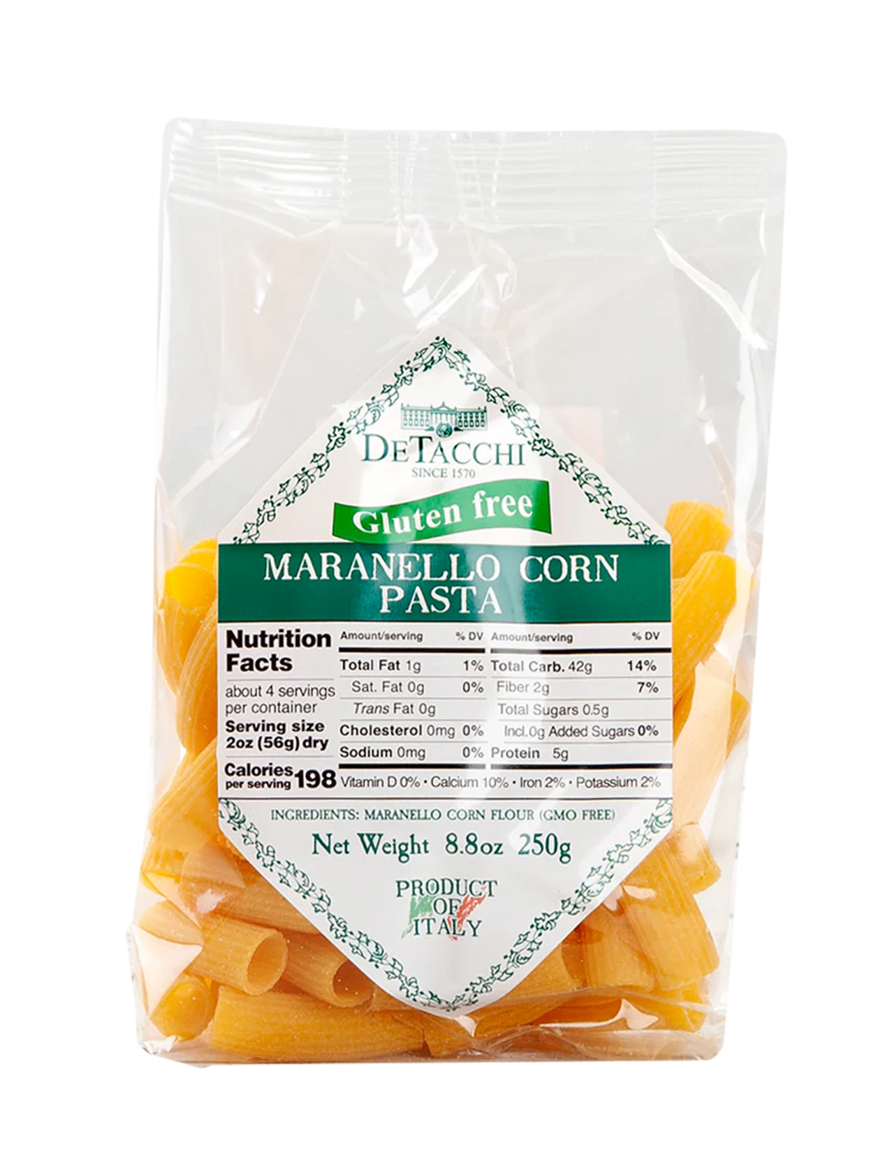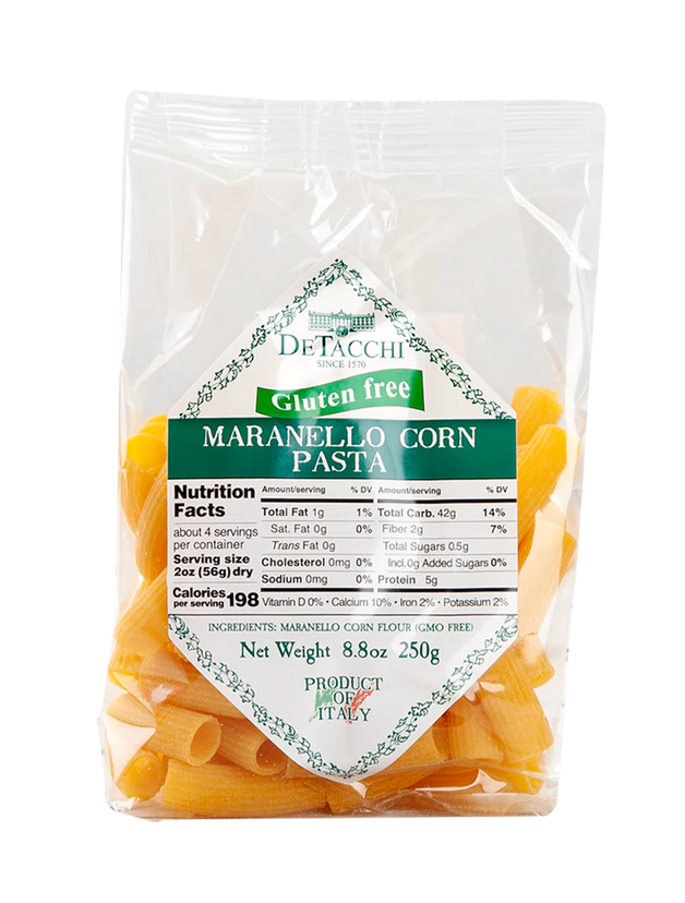 This gluten free Maccheroni pasta from Detacchi is made of 100% Maranello Corn, which is an ancient Italian variety grown in the Venetian area by De Tacchi with slef-made seeds. This classic traditional Italian pasta is an indispensable ingredient in recipes such as cacio e pepe or alla norma. This pasta cooks in about 10/11 minutes.