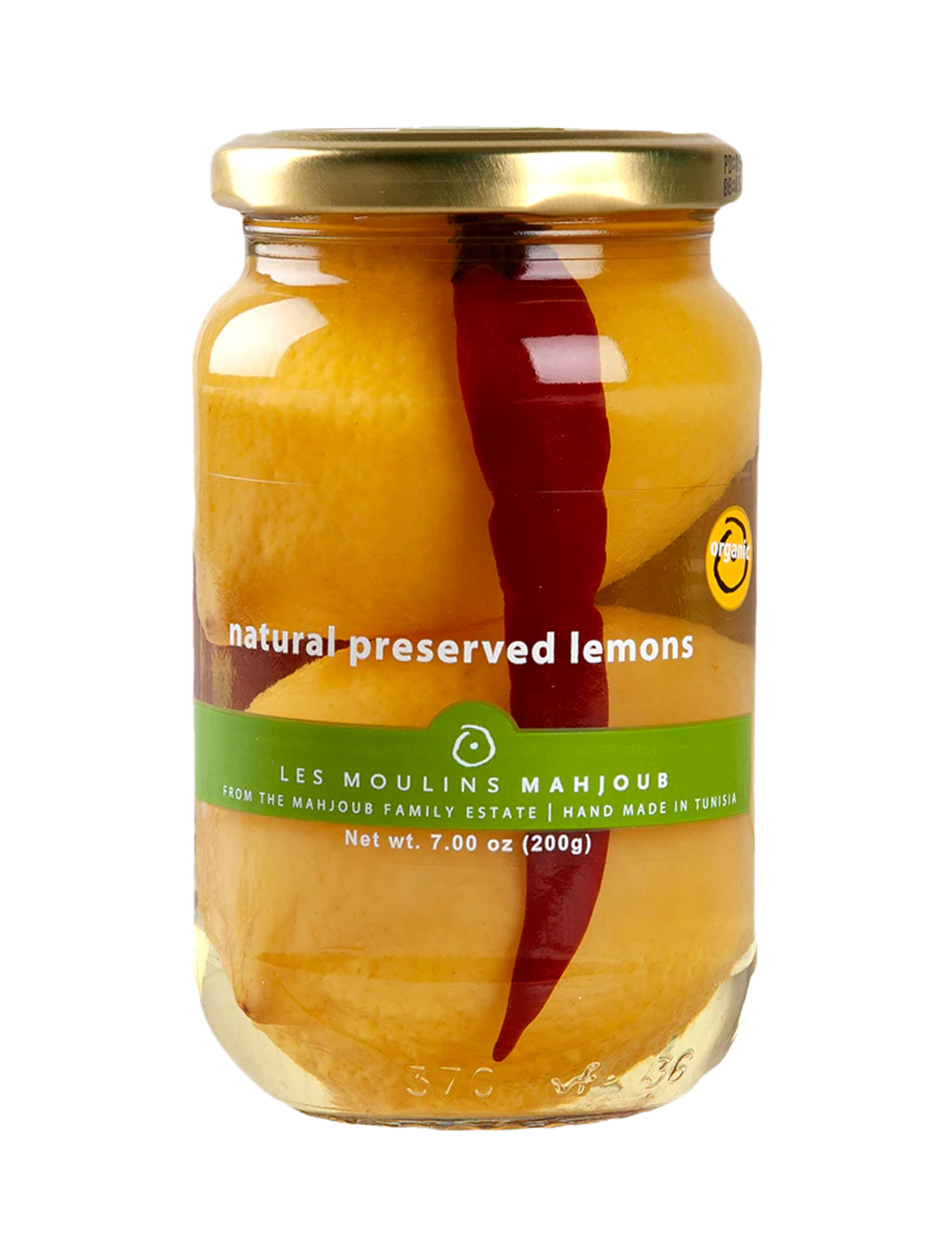 These organic Tunisian lemons from Les Moulins Mahjoub are preserved whole with the addition of a mild red pepper to create an additional layer of flavor. The preserved lemon adds a citrus flavor and aroma, with a less acidic flavor than your average lemon. Both the rind and the pith can be utilized.