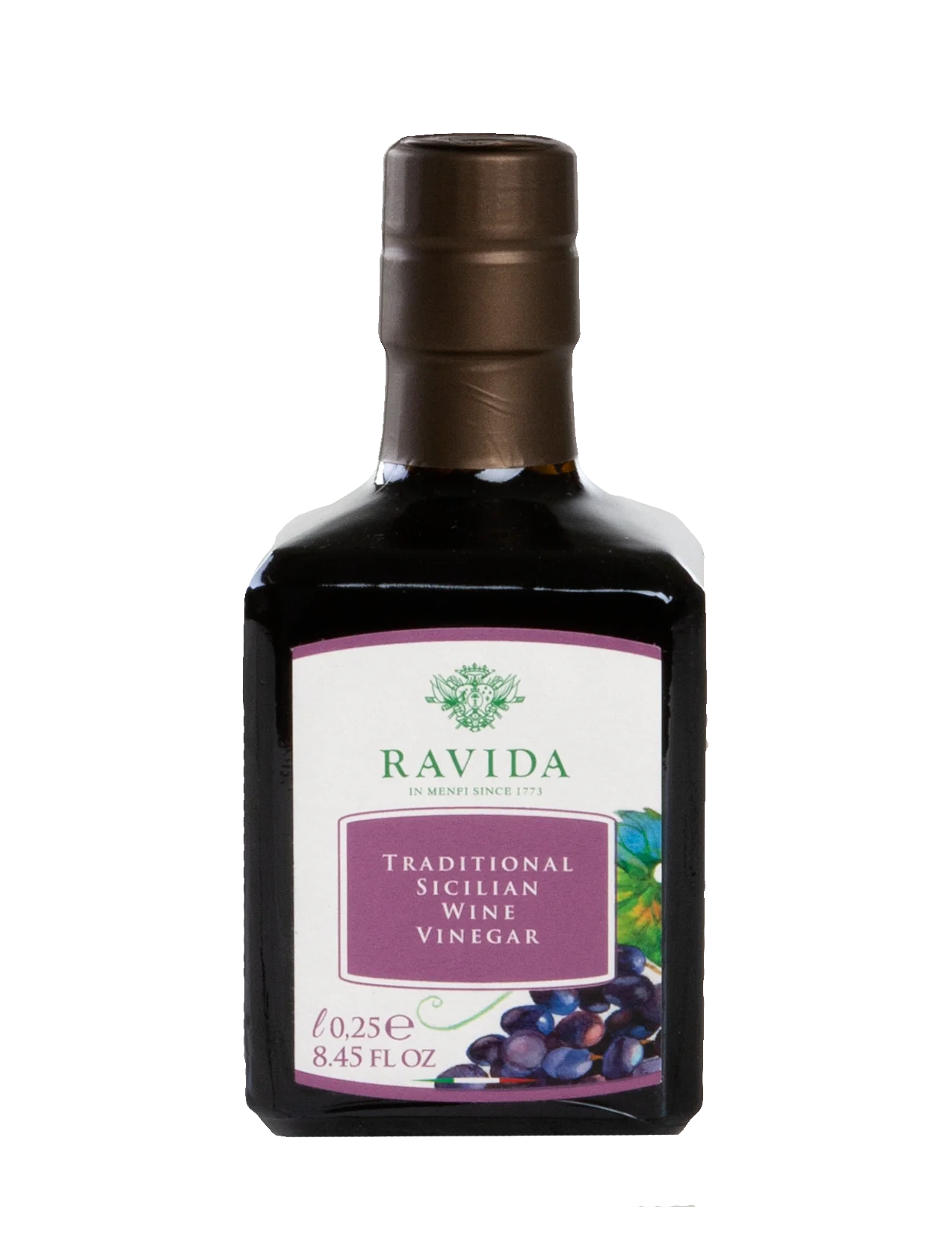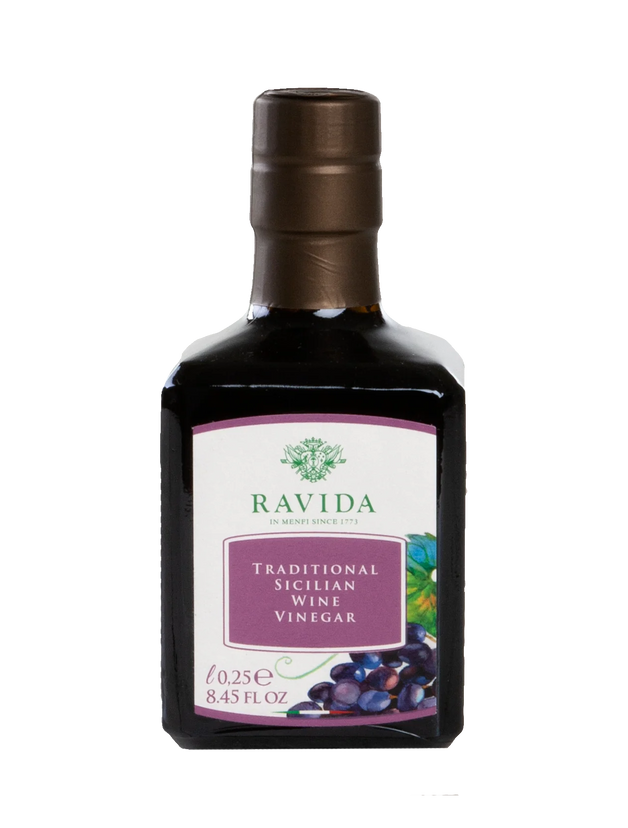 Discover the exquisite flavor of Ravida Red Wine Vinegar, a product of the Marsala area in Sicily, Italy. This vinegar is crafted from a blend of Grillo and Catarratto grape varieties, the same grapes that have contributed to the renown of Marsala wines. Following a closely guarded recipe, the grape must is fermented and aged in wooden barrels for a minimum of four years, resulting in a vinegar that is dry yet bursting with the sweet, rich flavors reminiscent of Marsala wine. The vinegar's lush aroma and intense flavors make it a standout addition to the world of vinegars, offering a unique and delightful taste experience.