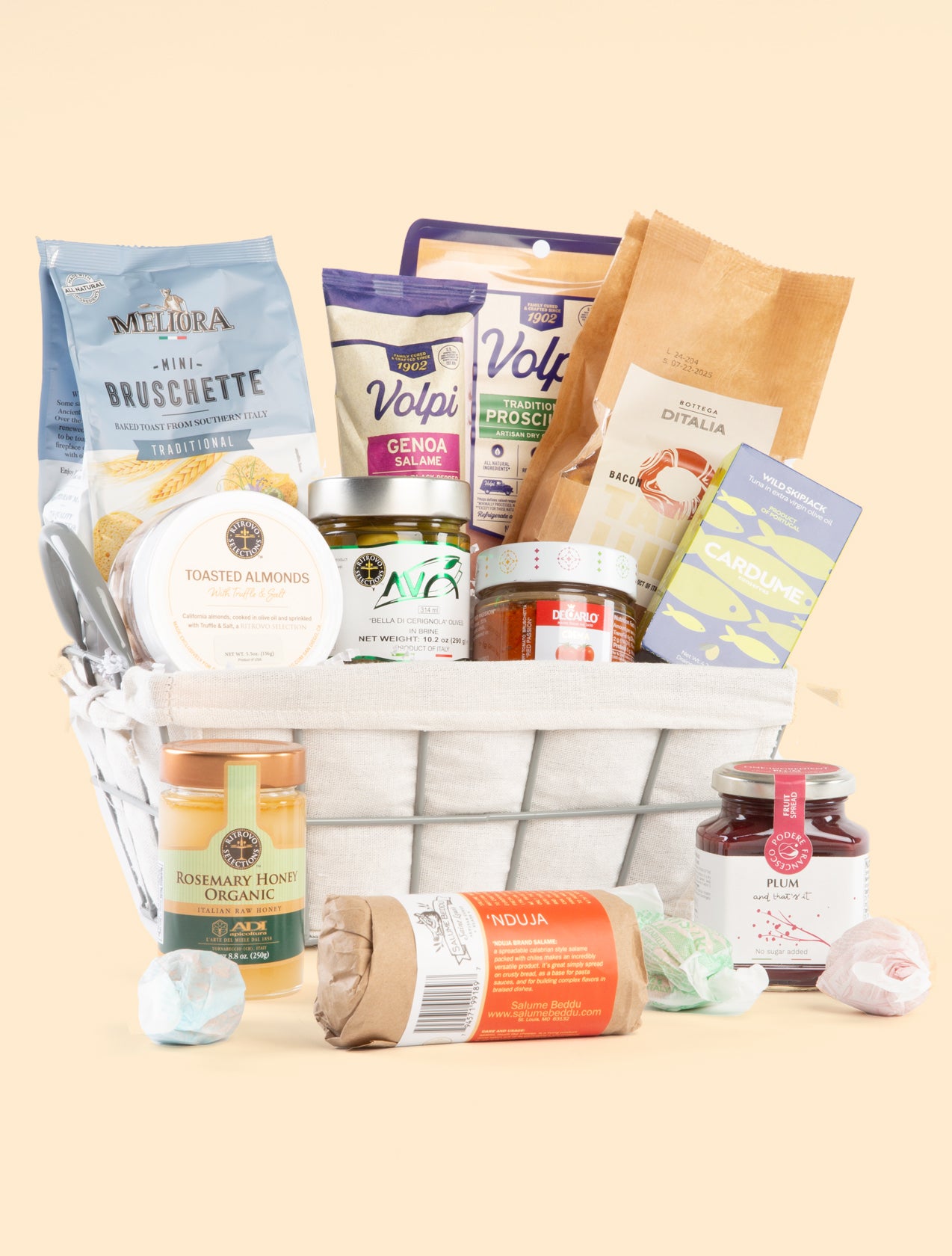 A curated collection of 11 mouthwatering Italian snacks presented in a chic wire basket lined with cloth. This is not your average snack pack—this assortment is a snacking journey, showcasing both classic and unique antipasti flavors. Dive into truffle salt-seasoned almonds and semi-dried cherry tomato tapenade, savor the lusciousness of plump Cerignola olives, and crunch into Bacon Tarallini crackers. Pair them with rich cured salumi and prosciutto, or spice things up with nduja spread on bruschette crackers. Tinned tuna, sweet plum jam, and organic rosemary honey add delightful surprises. It’s the perfect gift, ready to open and devour on the spot. Each bite is an invitation to indulge in Italy’s vibrant snacking culture.