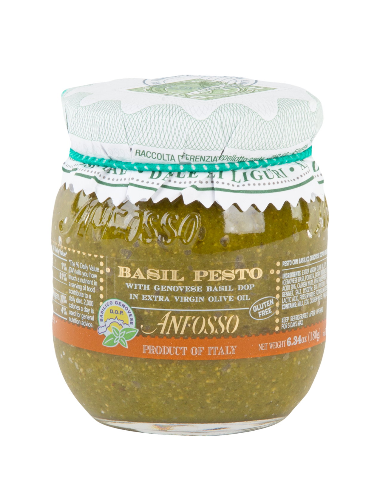 Pesto Genovese is the most famous pesto in all of Italy. At the heart of Anfosso's Genovese Basil Pesto are four ingredients: DOP Genovese Basil, Extra Virgin Olive Oil, Pine Nuts, and Grana Padano Cheese. Earthy, yet bright, this pesto is perfect tossed with pasta and spread on paninis.