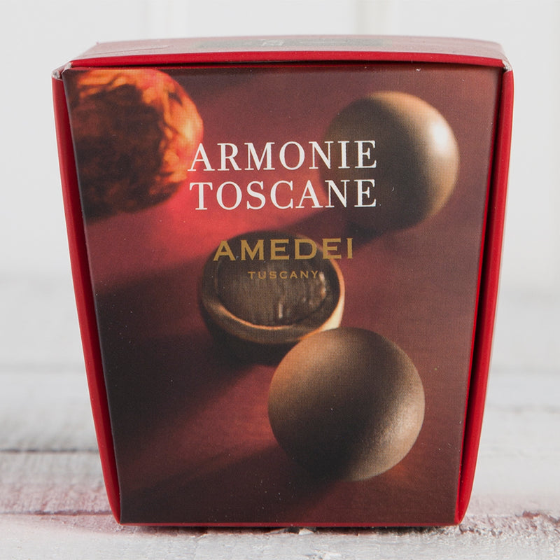 Amedei Armonie Toscana Red is an elegant 12 piece praline assortment with a mix of 3 pralines in milk, white milk, and dark chocolate.