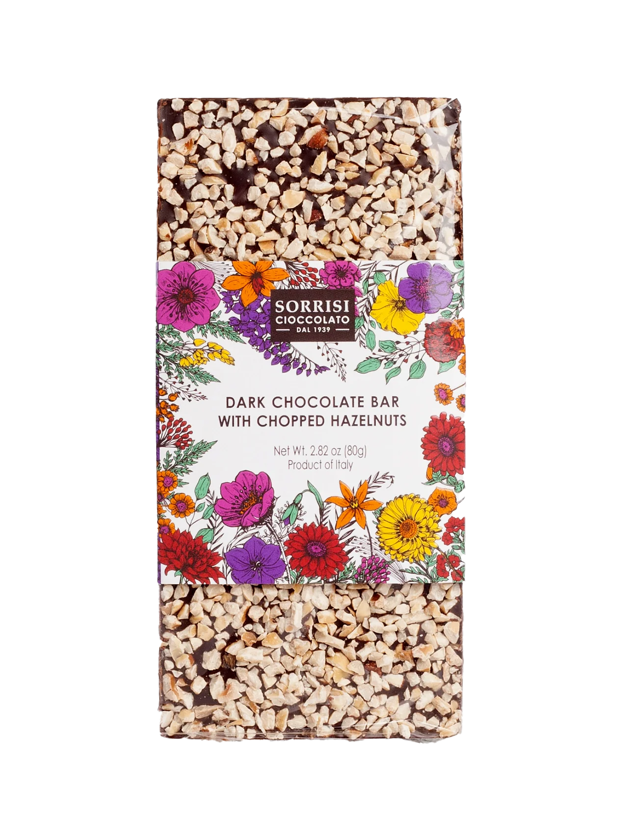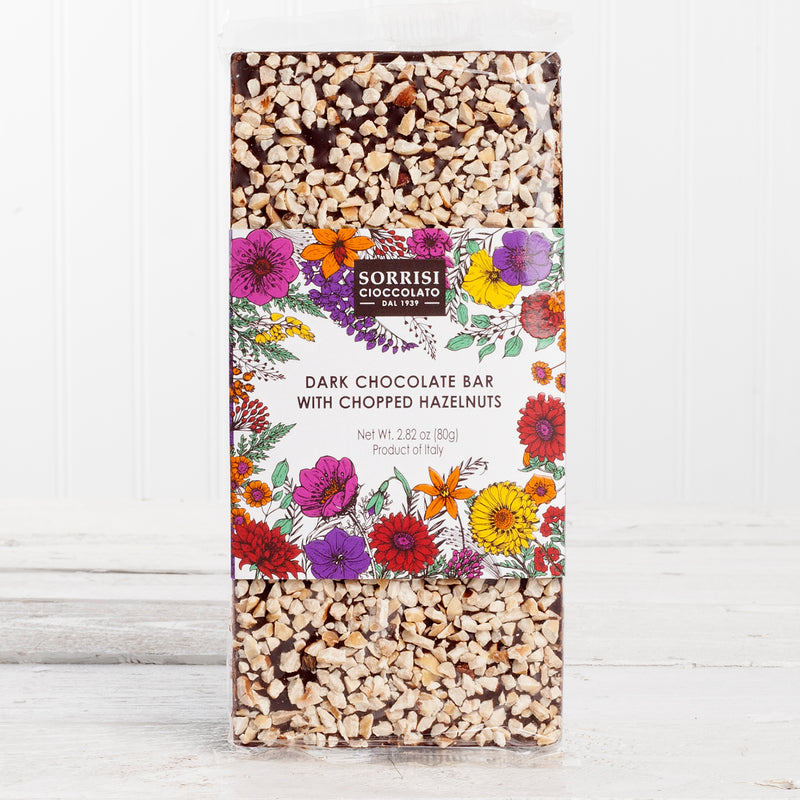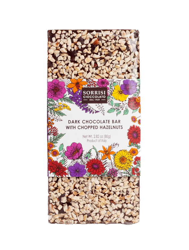 Boella & Sorrisi Dark Chocolate Bar featuring chopped hazelnuts from Turin, Piedmont. Decadent rich dark chocolate (55% cocoa) is beautifully adorned with chopped hazelnuts. Every bar is meticulously crafted with premium ingredients, ensuring a visual and flavorful treat that transcends the ordinary.