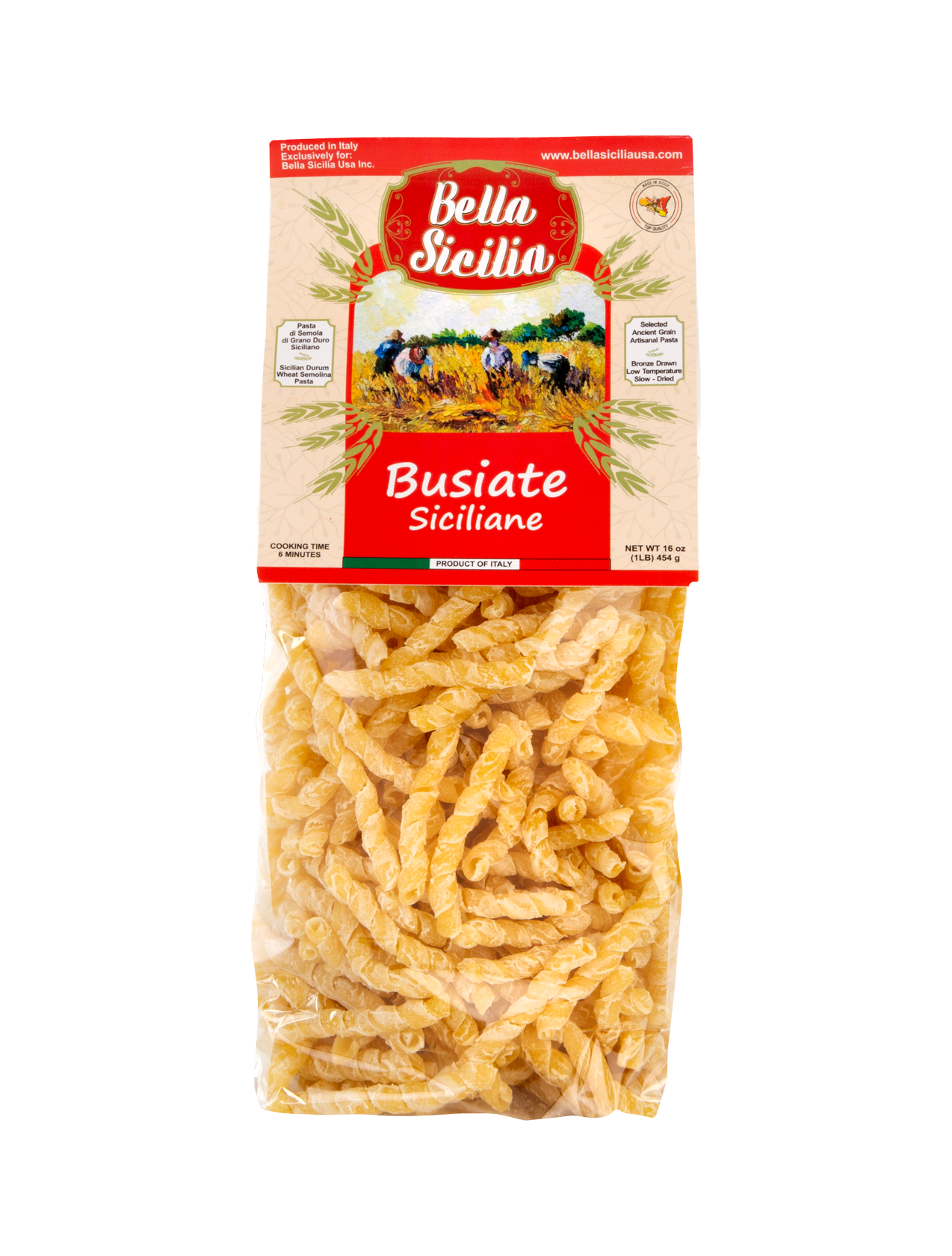 This long, spiraled pasta, typical of the Trapani region, is expertly crafted to hold sauces beautifully. Inspired by tradition, its unique shape comes from the Sicilian busa grass, once used to form each coil. Perfect for rich, flavorful dishes, try it with a classic Trapanese pesto for a true taste of Italy.
