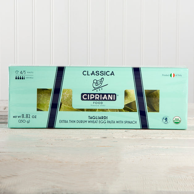 Served in all of the Cipriani Restaurants around the world, Tagliardi with Spinach is an extra thin pasta made from organic durum wheat semolina, organic eggs, and organic dehydrated spinach. The dough is meticulously pressed through bronze cylinders one hundred times, which gives a delicate texture. It is air dried at a low temperature for 16 hours. Tagliardi are the Cipriani interpretation of the maltagliati, a typical pasta shape found in the Emilia-Romagna region of Italy. They come in squares of about 1 inch by 1.