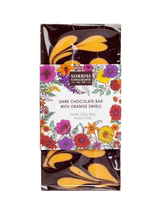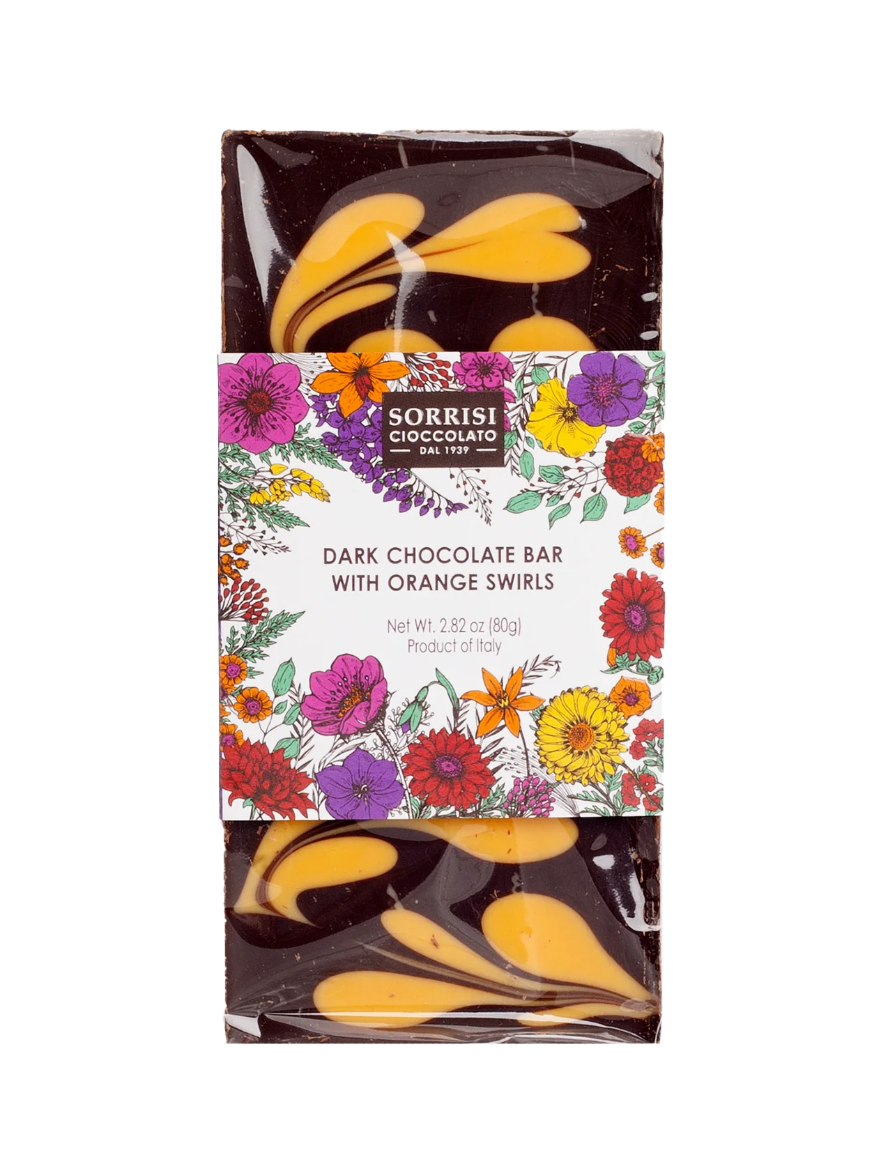 Boella & Sorrisi Dark Chocolate Bar featuring Orange Swirls from Turin, Piedmont. Delight in the decadence of rich dark chocolate (55% cocoa) beautifully adorned with captivating orange swirls. Every bar is meticulously crafted with premium ingredients, ensuring a visual and flavorful treat that transcends the ordinary.