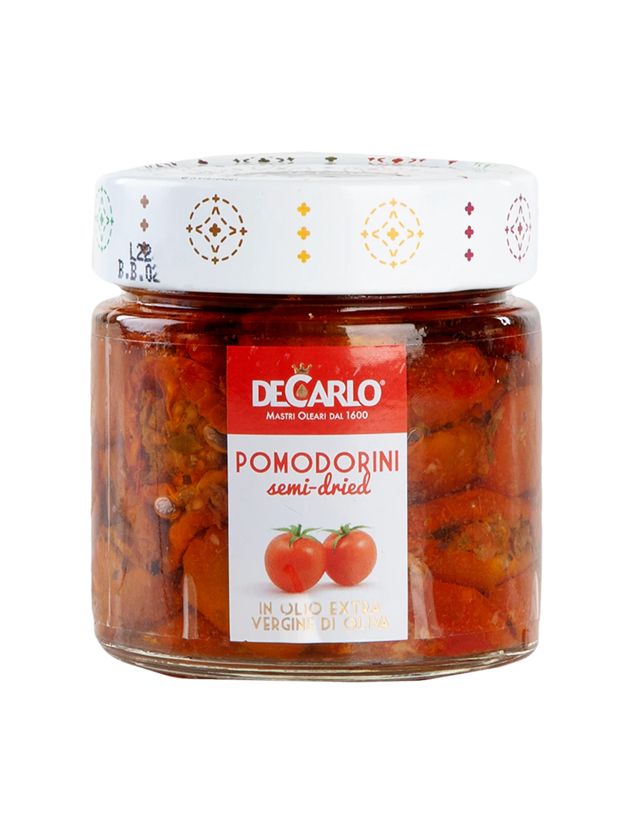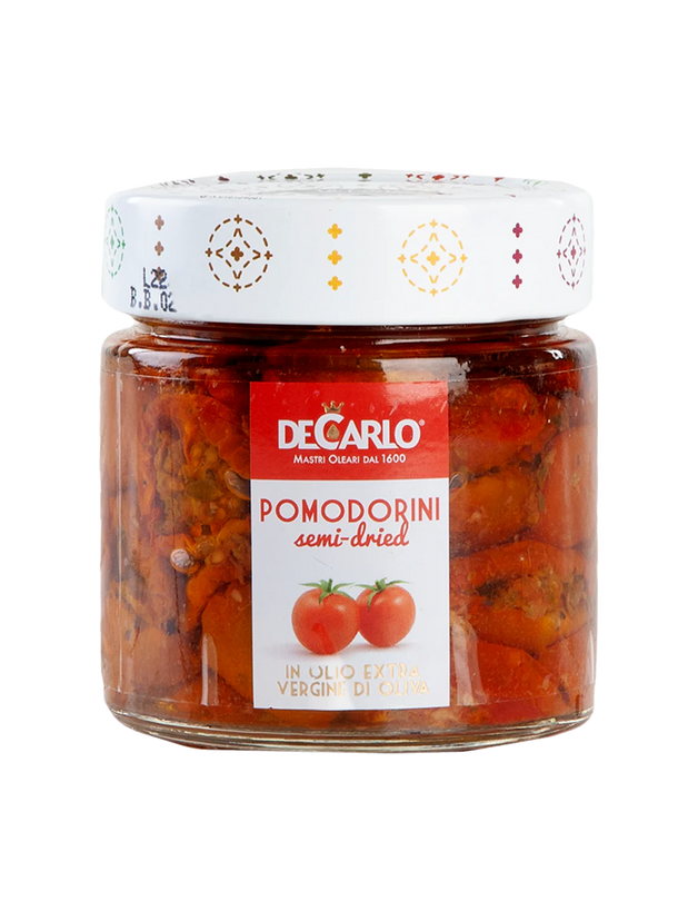 DeCarlo half-dries cherry tomatoes for a pronounced sweetness and retained freshness. Preserved in estate-grown DeCarlo extra virgin olive oil with garlic, salt and herbs, these little beauties are brilliantly simple. Enjoy them with fresh ricotta, mozzarella, shaved Parmesan, pecorino, or just about any cheese. Top a pizza, toss into pasta, add to sandwiches, or mix with fresh tomatoes in a salad.