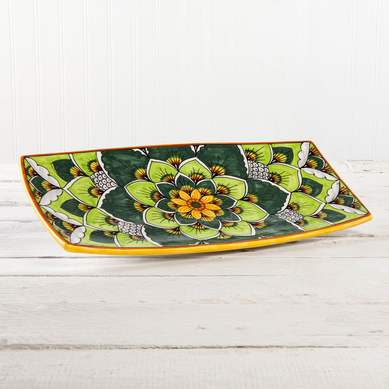 Deruta Geometric Green and Yellow Flower Pattern Rectangle Plate (5 inch x 12 inch)