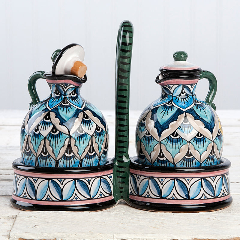 Deruta Geometric Peacock Pattern Oil and Cruet Set (Blue)