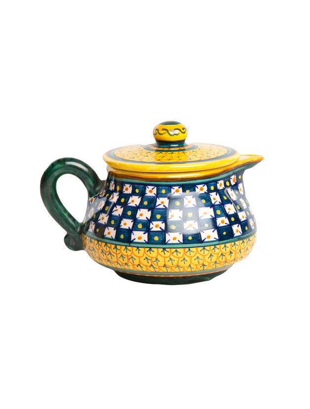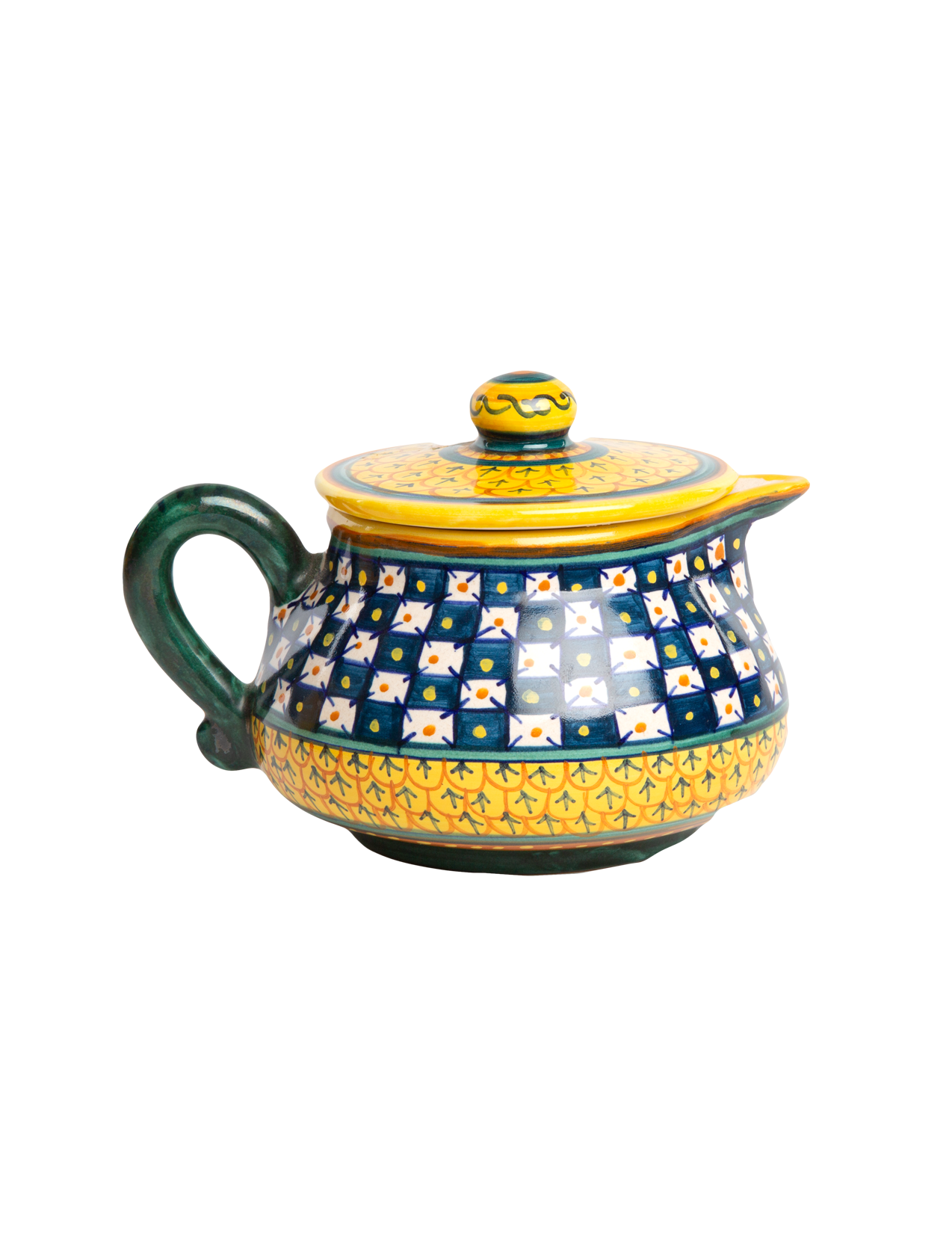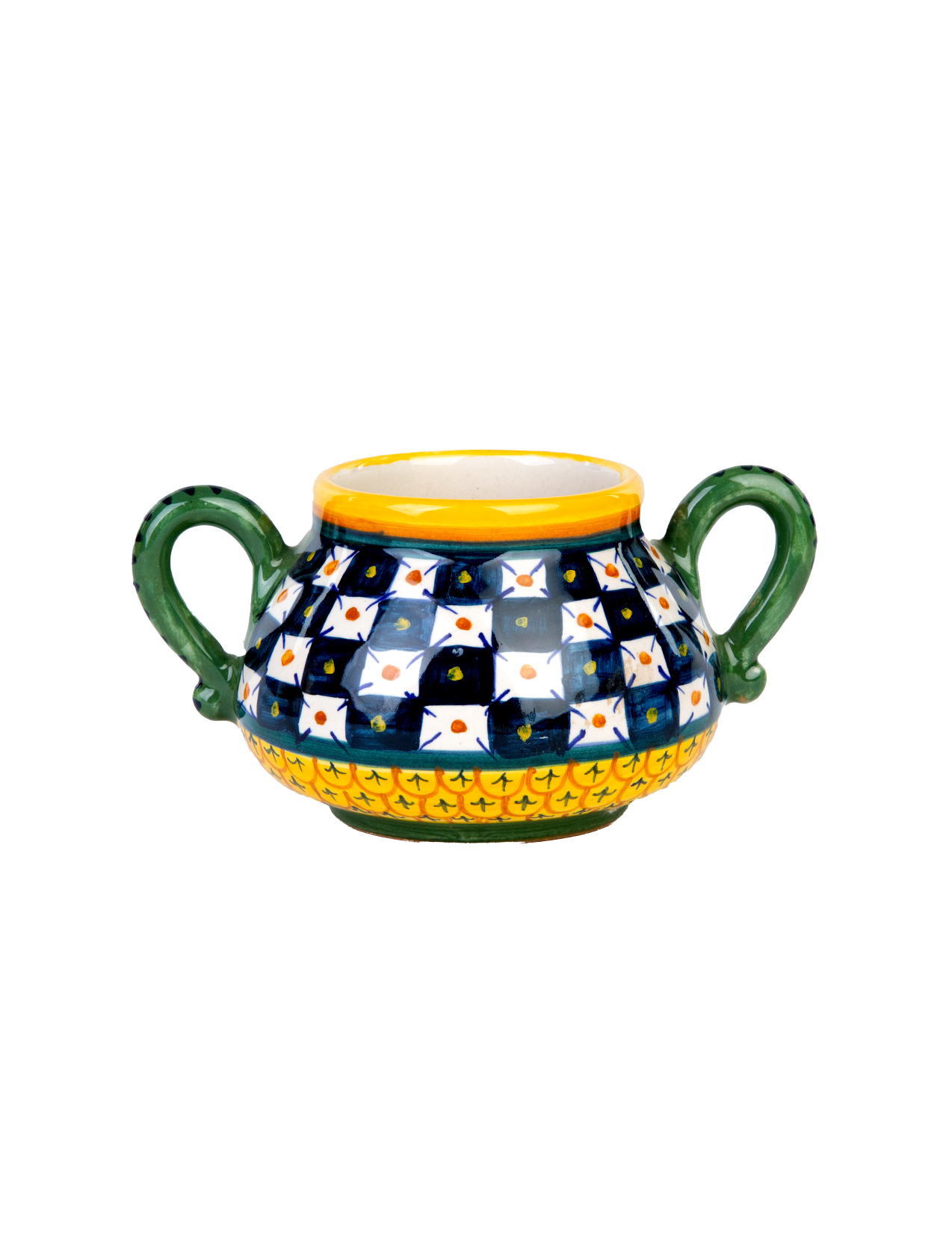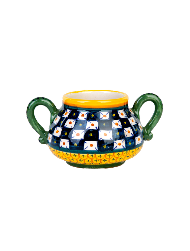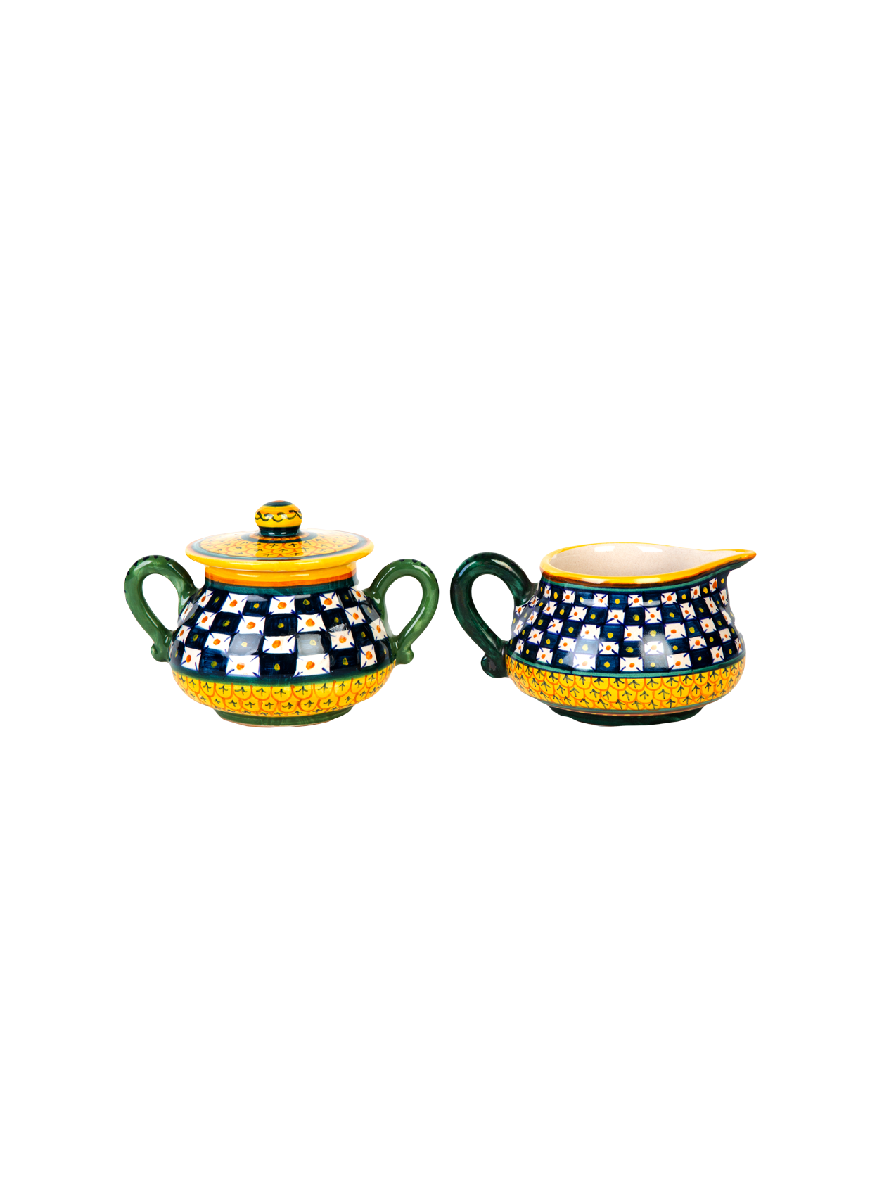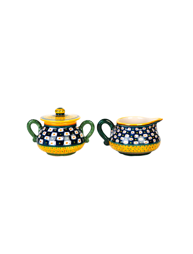 Handmade in Deruta, Italy, this matching creamer and sugar bowl set features Geribi’s signature Geometric Yellow motif — a bold, sunlit pattern inspired by centuries-old maiolica design. Each piece is individually hand-painted by skilled artisans, making every set unique in color and detail.