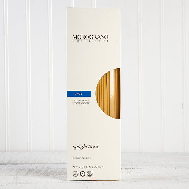A little larger than the standard spaghetti. Matt single origin durum wheat is a resilient and rich grain variety farmed in the sunny fields of Puglia and Sicily. The Felicetti family of master pasta makers then crafts and dries the pasta using the air of the Dolomites, an invaluable ally that flows through rocks, forests and glaciers, capturing the very essence of the mountain before reaching the drying rooms at Felicetti. Take your favorite pasta to the next level.