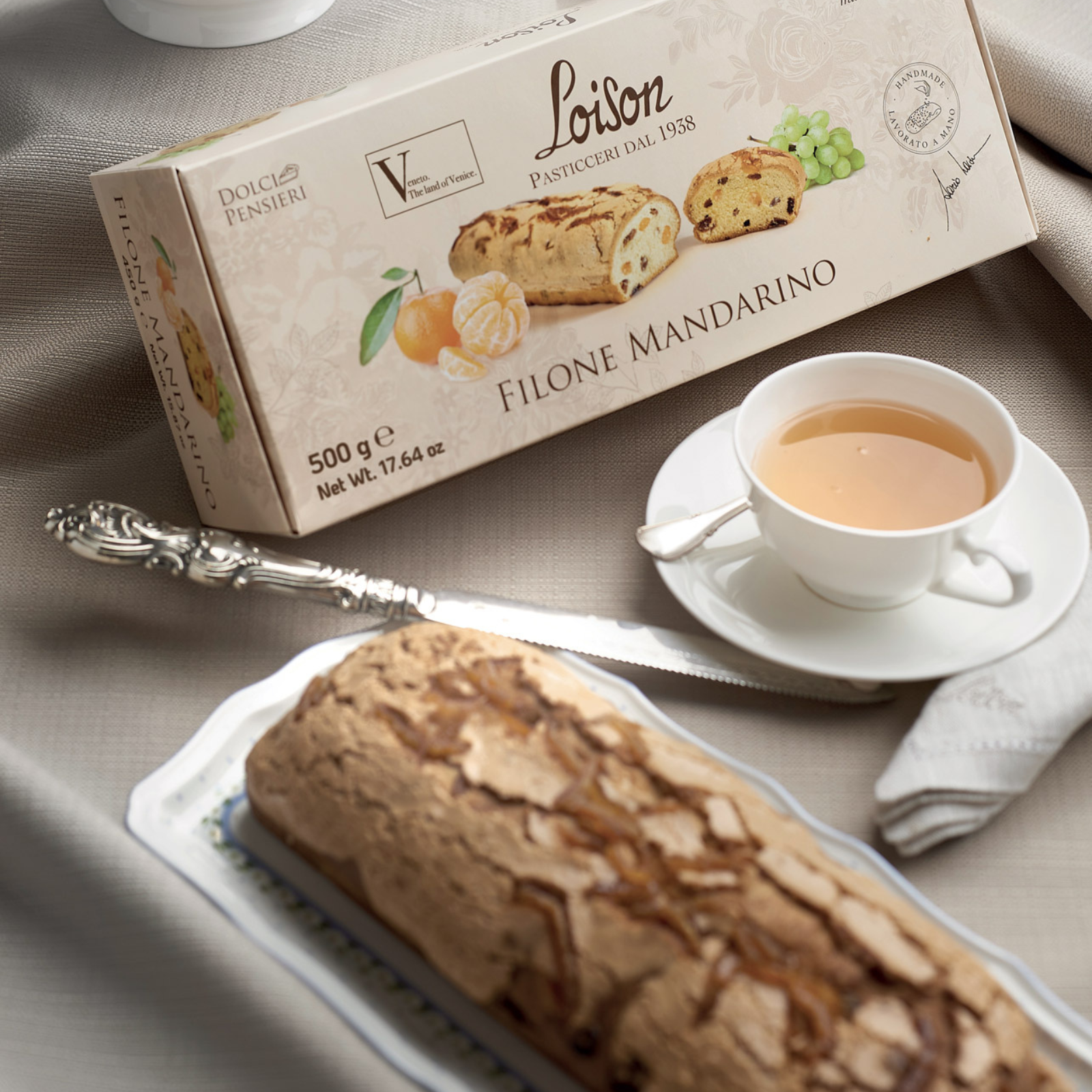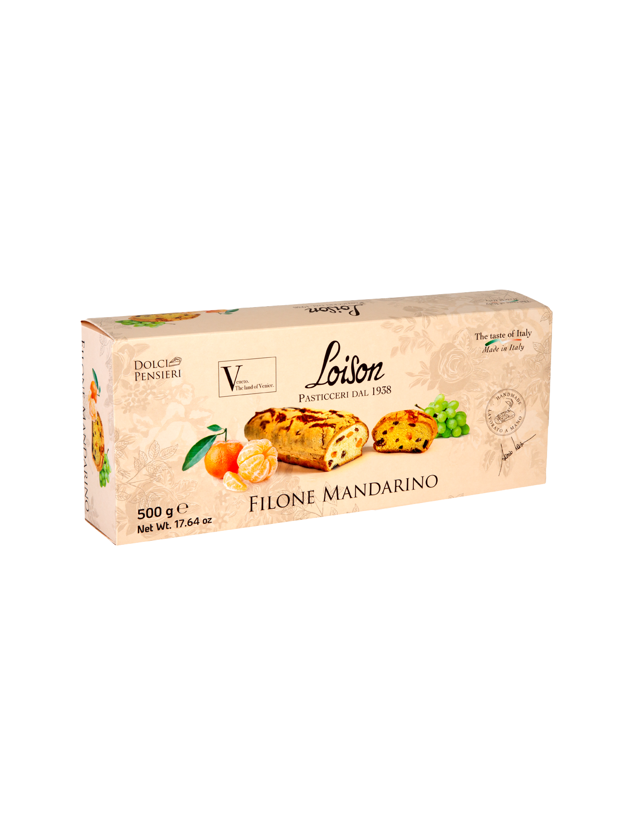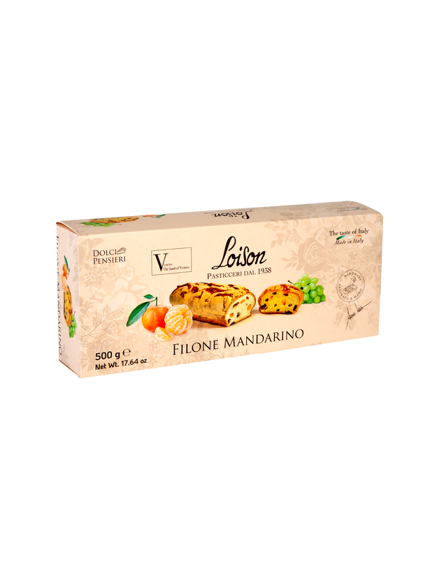 Loison Filone Mandarino is an artisan fruit bread, naturally leavened with sourdough and rooted in a time-honored family recipe. Enriched with juicy raisins and the fragrant candied peel of late Ciaculli mandarin—a prized Slow Food presidium—this soft, airy loaf is topped with a delicate glaze made from PGI Piedmont hazelnuts, offering a unique blend of texture and vibrant citrus flavor.