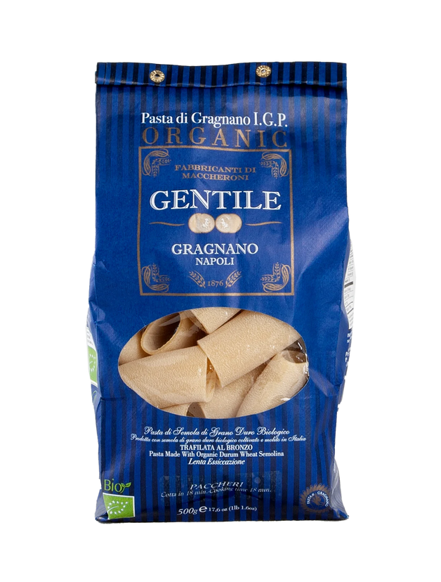 Paccheri is a broad, tube-shaped pasta absent ridges. The selected semolina wheat used in this pasta is strictly of Italian origin and of the best quality, including the Senatore Capelli variety which is renowned for cooking to al-dente. It also gives the pasta a golden color. Bronze cut pasta molds create a rough and porous texture much like homemade pasta. The low temperature drying method known as cirillo preserves the distinct texture and aroma.
