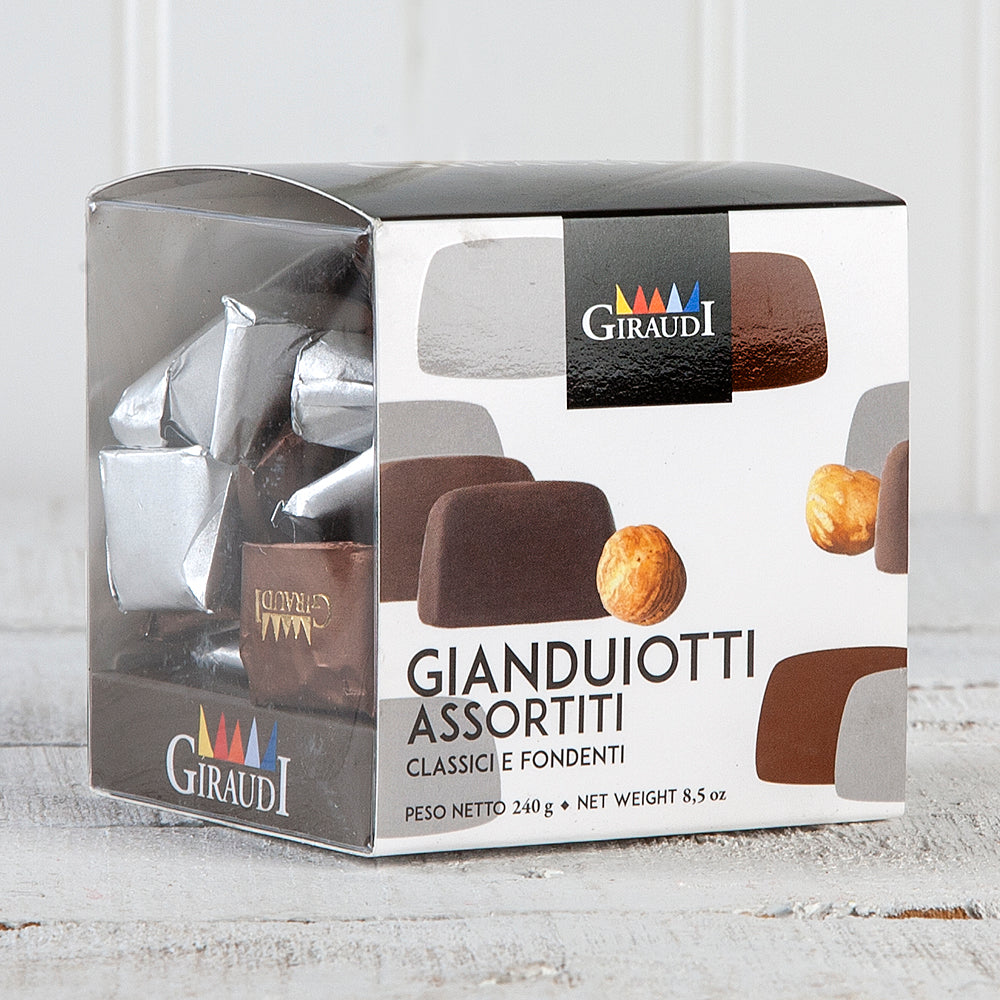 The Piedmontese know that nothing goes better together than chocolate and hazelnut. Giraudi's Gianduiotti Misti, or mixed gianduia, bonbons are a testament to this classic combination. Pureed I.G.P Hazelnuts from Piedmont, Italy are blended with milk or dark chocolate to create a smooth, melt-in-your-mouth chocolate confection. Individually-wrapped in silver and bronze foil, these Italian candies make a lovely hostess gift.