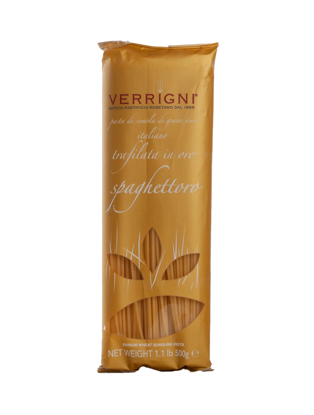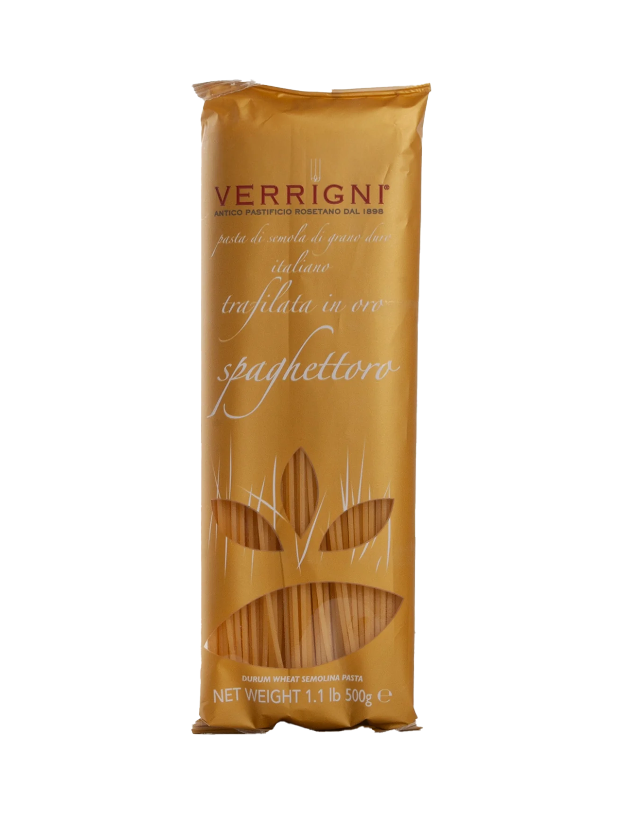 Imported from Abruzzo, Italy, Verrigni is the only gold dyed pasta in the world. Many of the most celebrated chefs in Italy use and appreciate Verrigni becauses of its selection of the finest grains and its use of ancient techniques. This fairly new gold die produced pasta has attracted much attention in recent years. This pasta has a very different consistency than those drawn by bronze die molds. Specifically, the gold-drawn pasta creates a distinct flavor and smell, and a look that is more intensely raw. When cooked, its absorption and swelling are rapid, and it provides a more slippery, smooth, more intense wheat taste and a more yellow color, a beautifully rich experience.