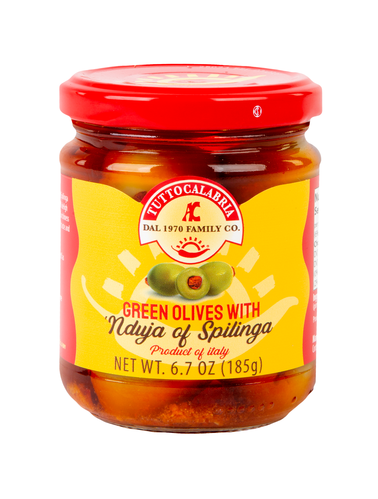 A bold Calabrian classic with a modern twist. These special olives are from Tuttocalabria. They are stuffed with authentic ’Nduja from Spilinga, delivering rich olive flavor followed by a warm, spicy kick. Ready to serve and perfect for aperitivo, antipasti boards, or snacking straight from the jar. Product of Italy.