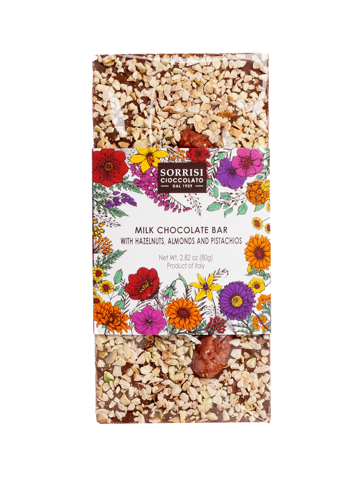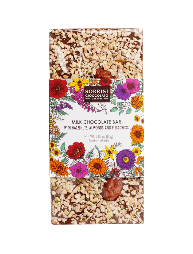Discover the luxurious blend of flavors in Boella & Sorrisi's Milk Chocolate Bar with Chopped Hazelnuts, Almond, and Pistachios. Artfully crafted in Turin, Piedmont, these artisanal chocolate bars are an exquisite indulgence. Immerse yourself in the velvety texture of creamy milk chocolate (32% cocoa), harmoniously combined with the delightful crunch of chopped hazelnuts, almonds, and pistachios. Hand-decorated with premium ingredients, these bars are a sensory delight, enticing both the eyes and the taste buds. Elevate your chocolate experience with this perfect union of quality craftsmanship, making it an ideal gift or a moment of pure chocolate bliss.