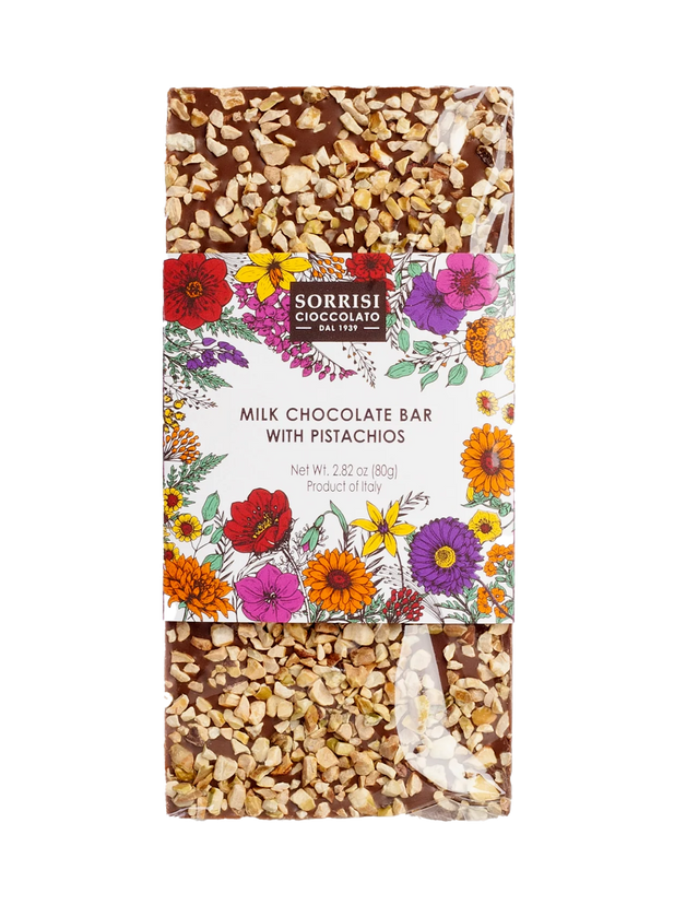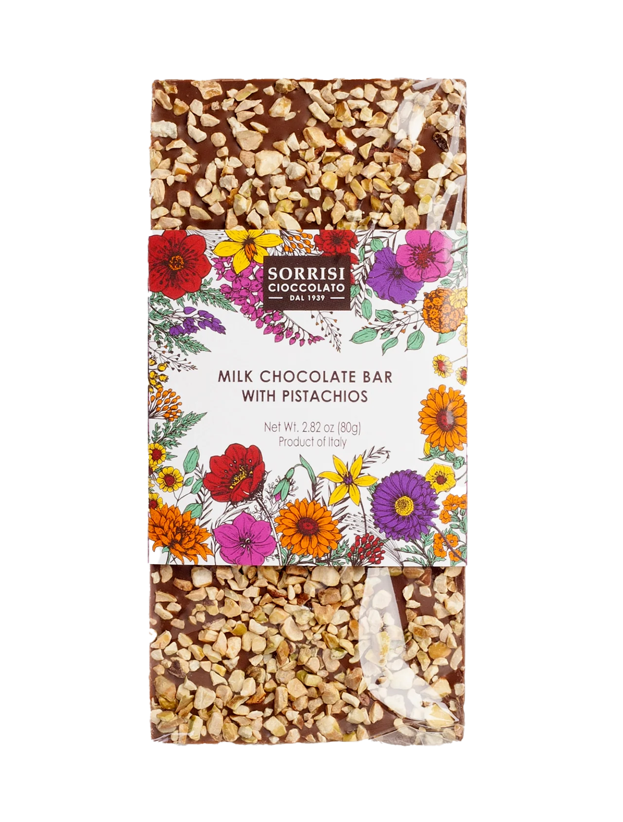Boella & Sorrisi Dark Chocolate Bar featuring chopped pistachios from Turin, Piedmont. Delight in the decadence of milk chocolate beautifully sprinkled with chopped pistachios. Every bar is meticulously crafted with premium ingredients, ensuring a visual and flavorful treat that transcends the ordinary.