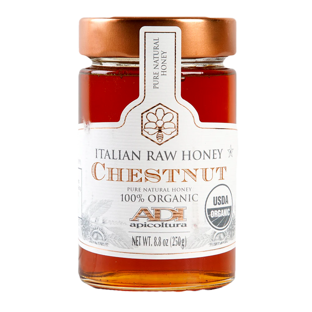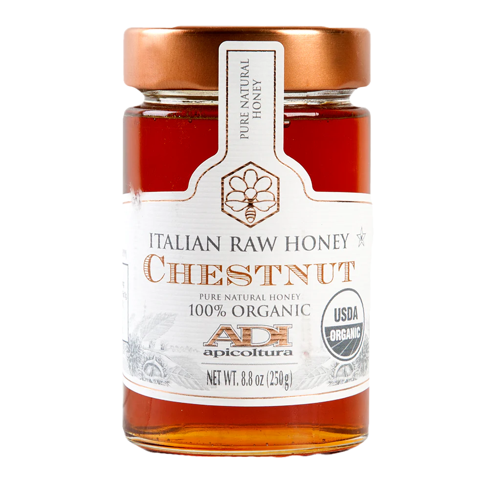 Item #SKU:HNY-120 ADI Apicoltura Raw Organic Chestnut Honey is dark in color with a rich, aromatic smell and complex flavor. Harvested from chestnut flowers between June and October, this particular honey is known for its anti-inflammatory and anti-bacterial properties. It pairs particularly well with savory food, including meats and aged cheeses such as Ubriaco, Montasio or Pecorino.