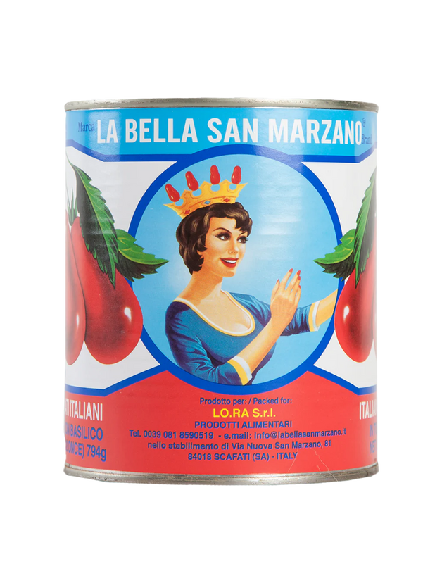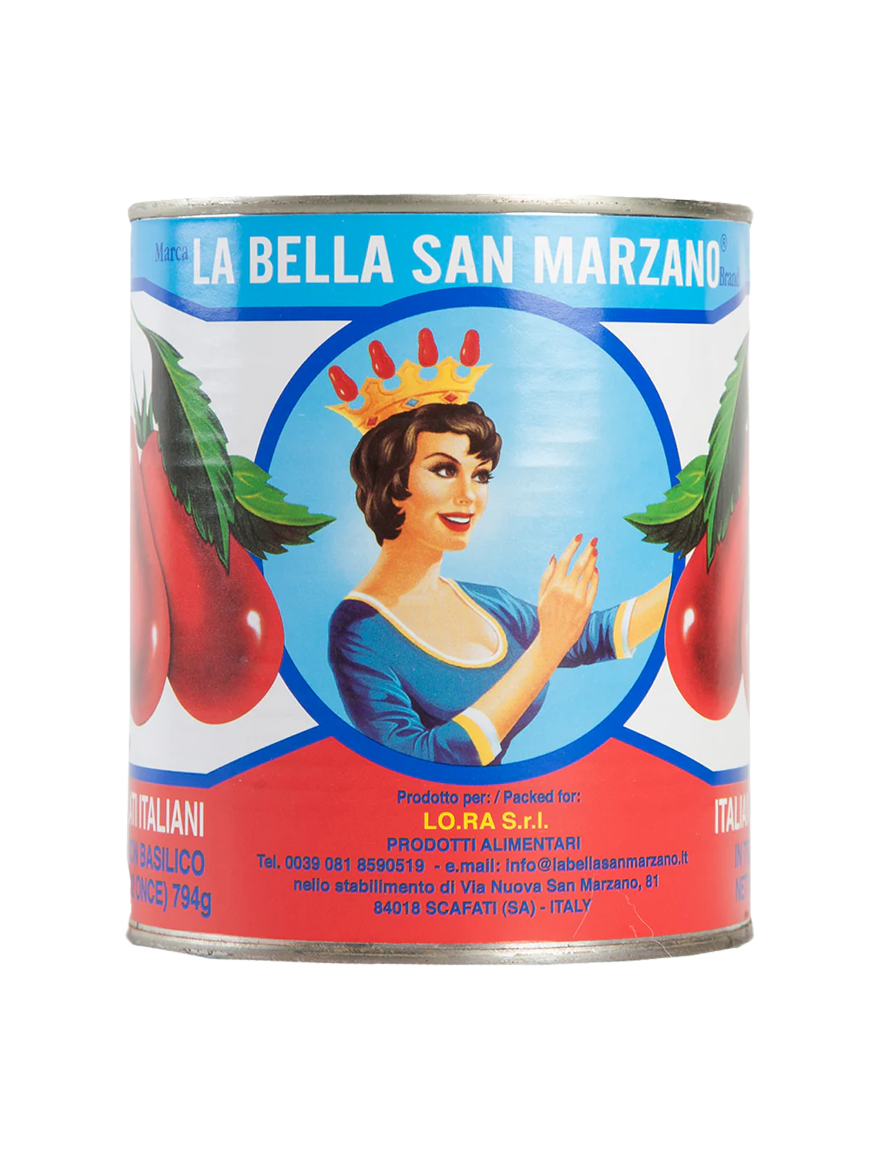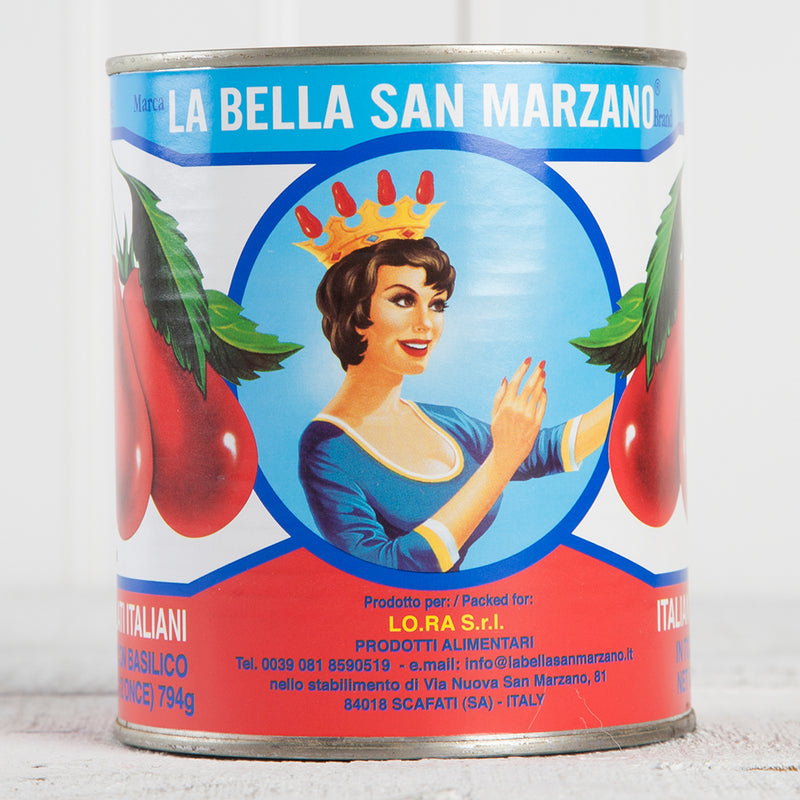La Bella San Marzano tomatoes are grown in the "agro nocerino", the area for D.O.P. San Marzano Tomatoes. La Bella San Marzano upholds the BRC Standard, considered by many to be an even higher level of quality and care. La Bella San Marzano cans their tomatoes immediately after picking, and adds basil leaf for a subtle aroma. We think La Bella San Marzano is a great tasting peeled tomato, suitable for a wonderful Sunday sugo.