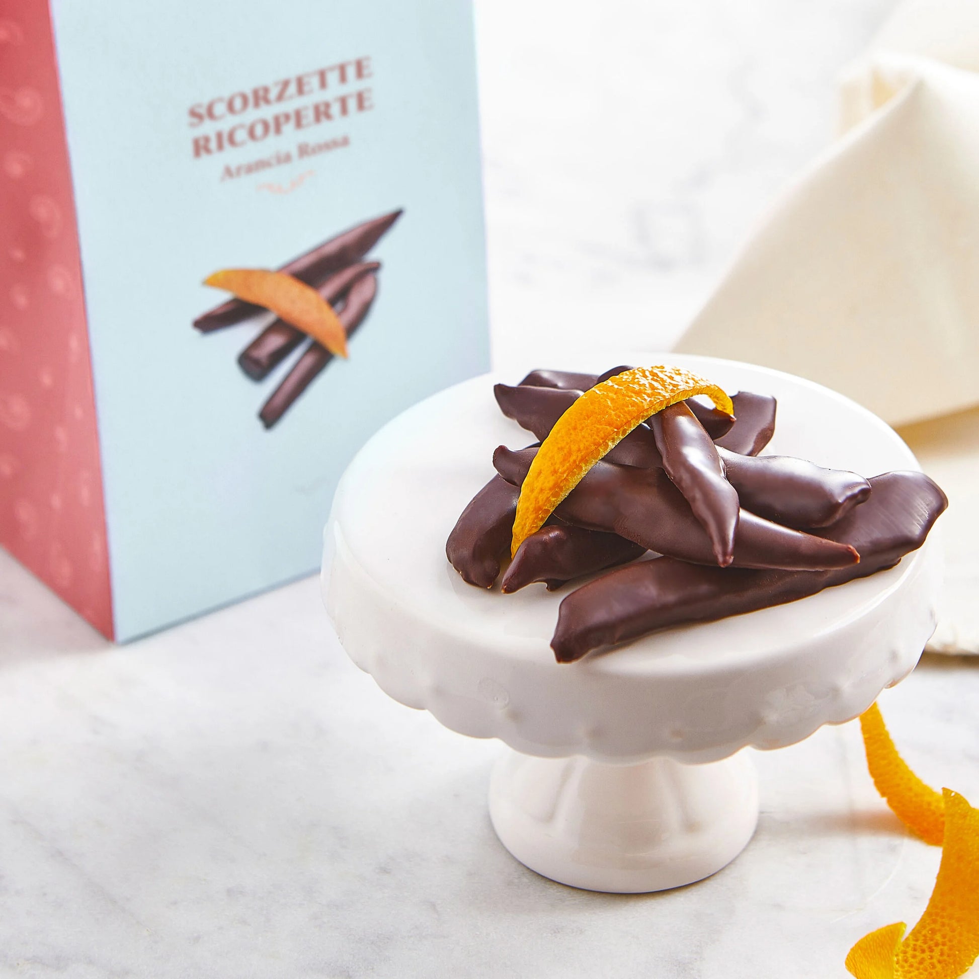 A bold nod to Mediterranean flavors, blending the zesty tang of Sicilian blood orange with a smooth Ecuadorian dark chocolate shell. Crafted with expertise by Sicilian chef Corrado Assenza, these candied rinds have a perfect balance of bitter chocolate and citrus acidity, with a satisfying crunch. Ideal as an aperitivo treat with cocktails or a sophisticated host gift, each box invites you to savor the refined, sun-drenched essence of Sicily in every bite.