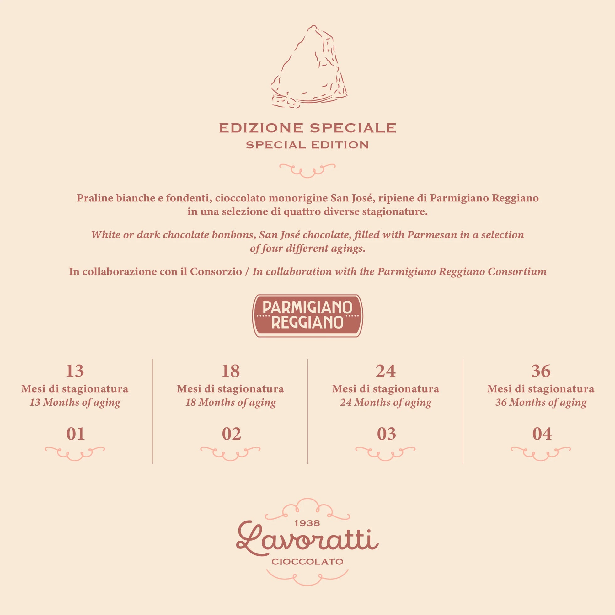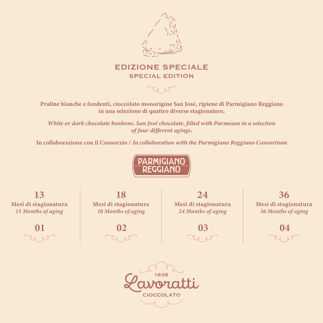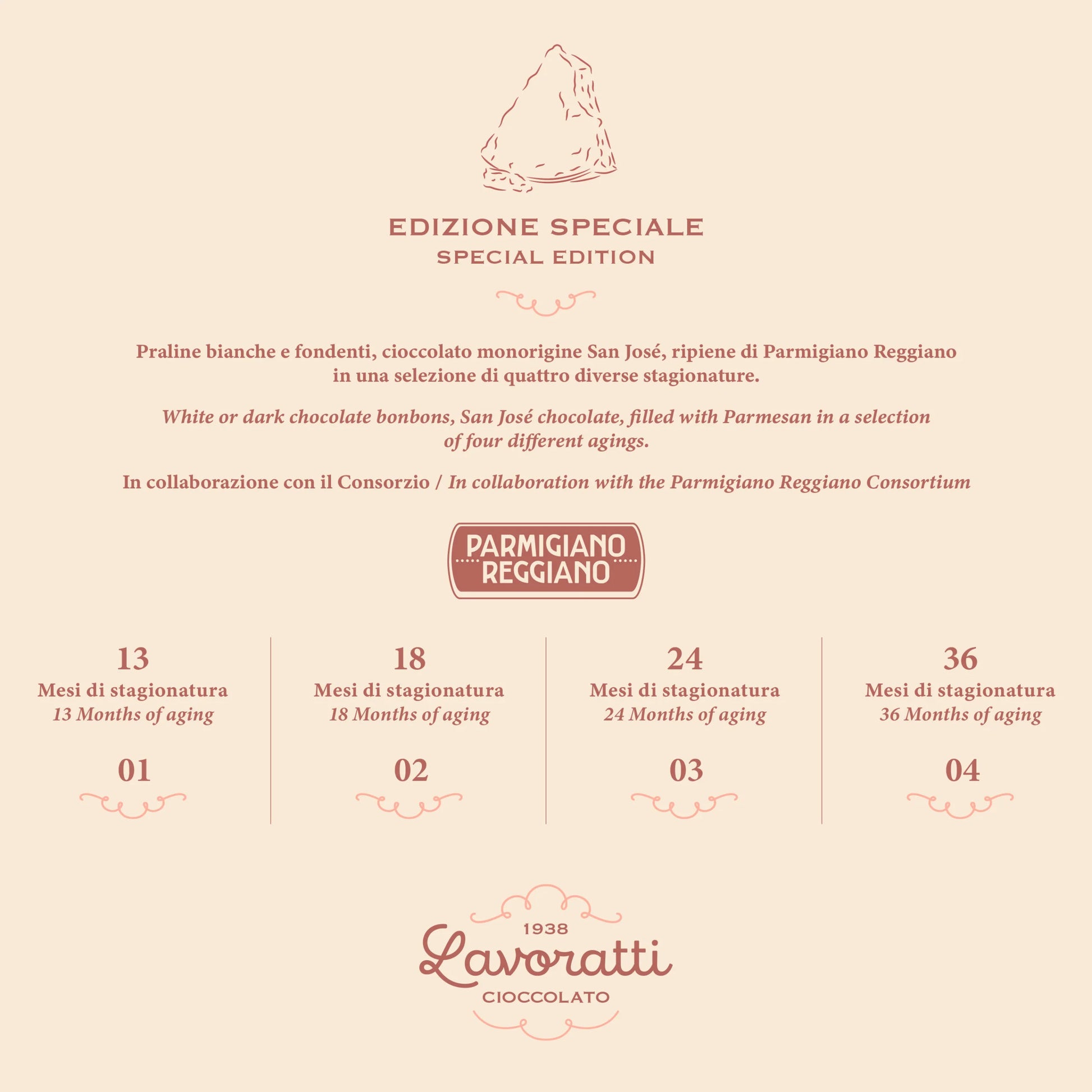 Lavoratti’s “The Original” Bonbons are a bold exploration of Italian flavors, blending the savory depth of Parmigiano Reggiano with the richness of chocolate. This box of eight bonbons features both dark and white chocolate shells filled with Parmigiano Reggiano ganache aged in four stages: 13, 18, 24, and 36 months. Designed as an unforgettable pre-dessert or an aperitivo delight, each bonbon unites sweet and savory in an unexpected, refined bite. Established in 1938, Lavoratti crafts chocolates that tell the story of the Mediterranean, one unique taste at a time.