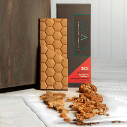 White chocolate with an attitude and a rich tan. We are delighted to introduce this exclusive collaboration with Shimon Otsuka of Nomis. Swiss caramelized white chocolate is paired with our favorite Amaretti del Chiostro cookies for a slight crunch in each bite. The depth and slight toastiness will not disappoint the most discerning chocolate lover's palate.