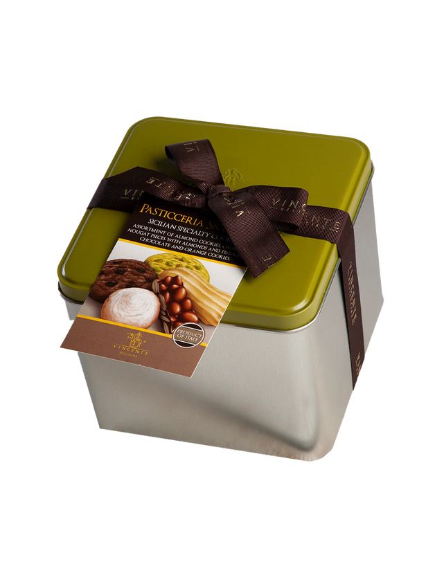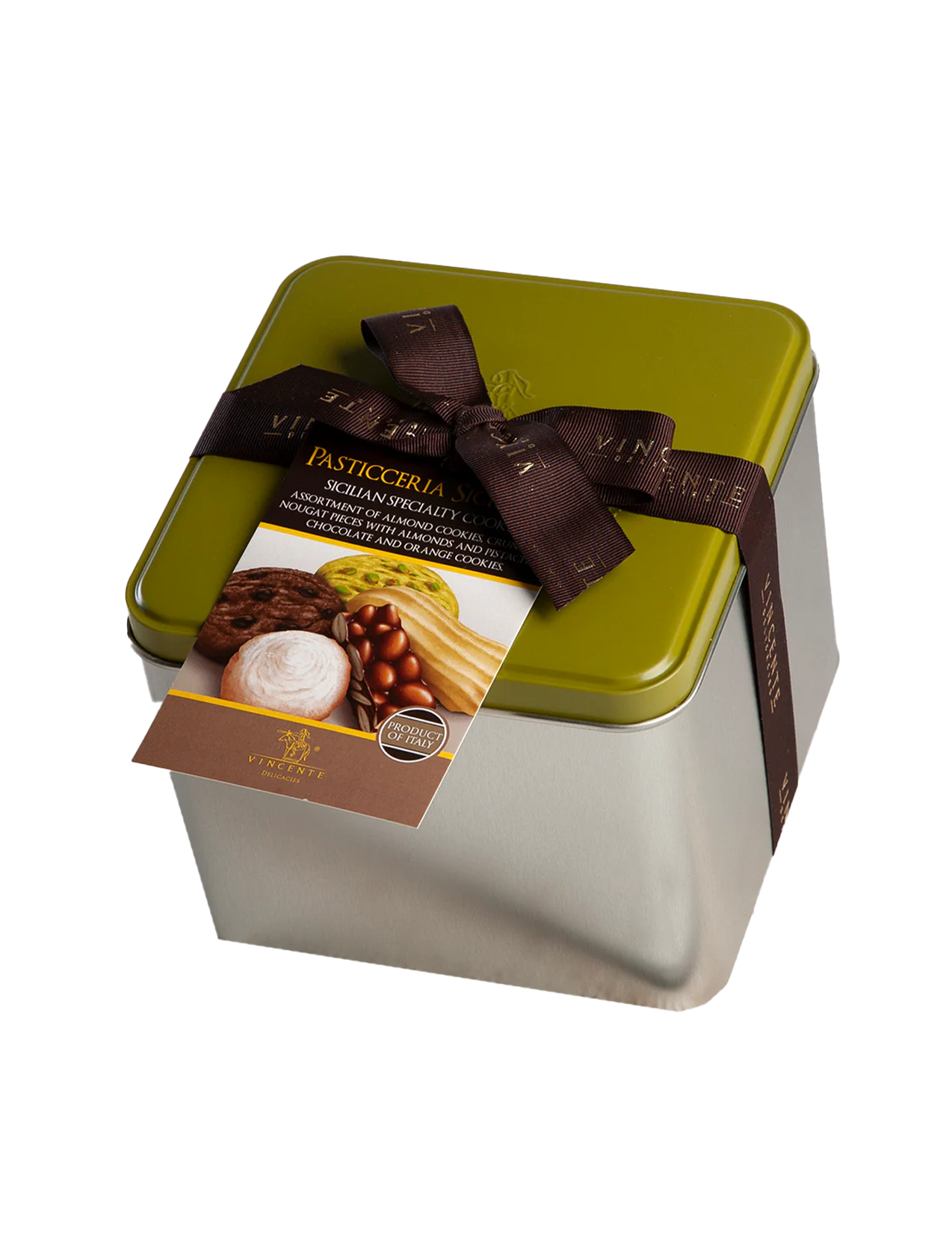 Pasticerria Vincente is a small, innovative producer from Sicily that is committed to using local and indigenous ingredients such as DOP Pistachios from Bronte. This perfect assortment of Sicilian cookies features five delicious cookies: crunchy nougat, pistachio, extra dark chocolate, classic almond, and orange. A delightful treat for your next party or gift exchange.