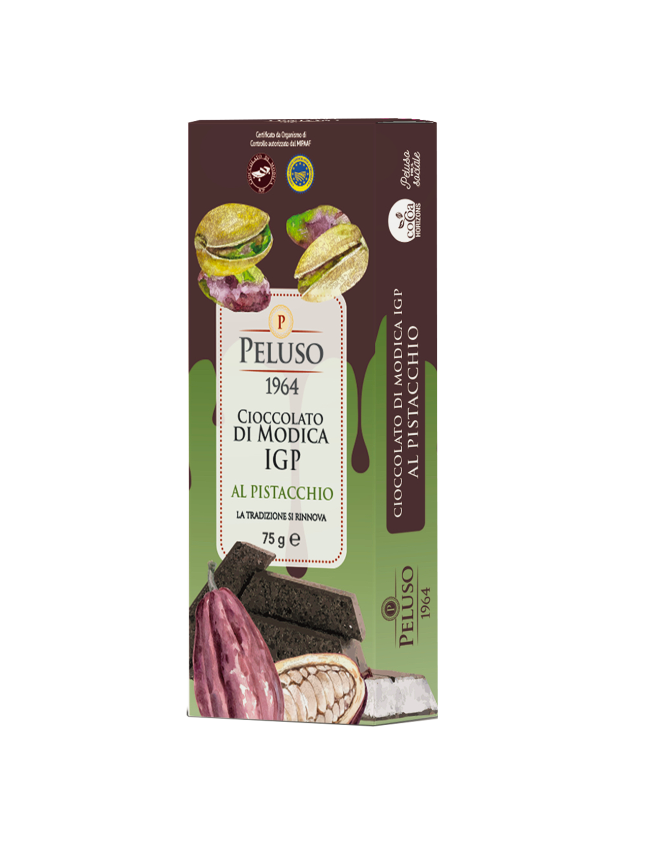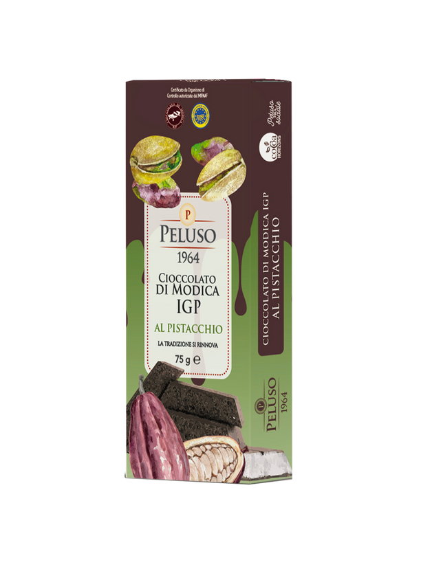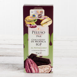 Discover the exquisite Peluso PGI Chocolate Bar with Pistachios, an opulent treat that redefines the chocolate experience. Hailing from the sun-kissed orchards of Sicily, this artisanal masterpiece has been honored as the "Pick of the Week" by Please the Palate. Made with precision and passion by Modica Chocolate, the bar is a testament to the purity of Sicilian traditions. Peluso's PGI Chocolate Bar embraces the coveted Protected Geographical Indication (PGI) cocoa beans of Sicily, adding a generous blend of locally sourced pistachios to create a symphony of flavors and textures. With every bite, you'll be transported to the rolling hills of Sicily, as the bold and rich chocolate beautifully melds with the sweet, nutty essence of the region's pistachios, making this an indulgence to savor. Modica chocolate is a local, Sicilian specialty, found nowhere else.