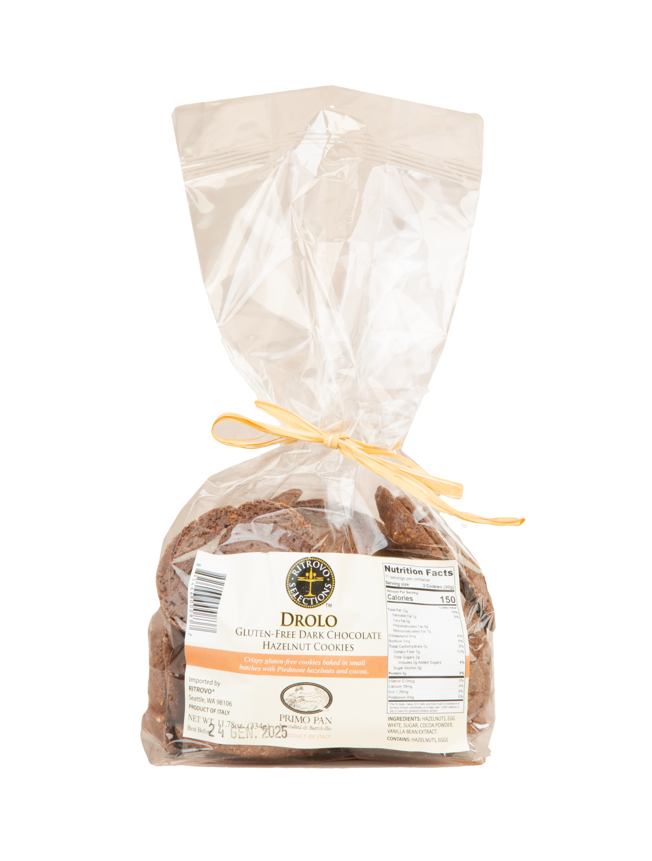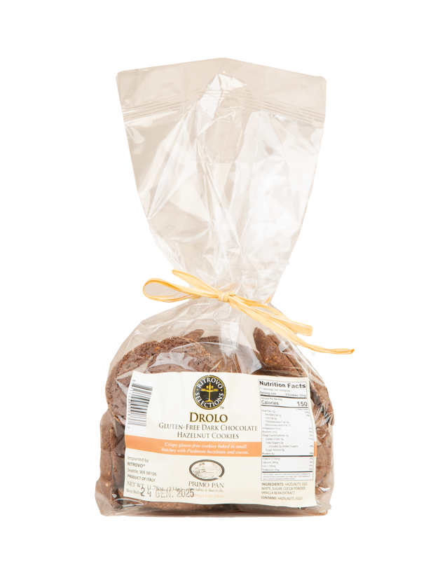 Drolo, meaning fun and light in Piemontese local dialect, are the name given to these cookies that reflect their light and airy weight. Made with 40% Piedmont hazelnuts, egg white, sugar, cacoa and vanilla, these biscuits will be a sure hit at the end of any meal with a glass of Moscato.