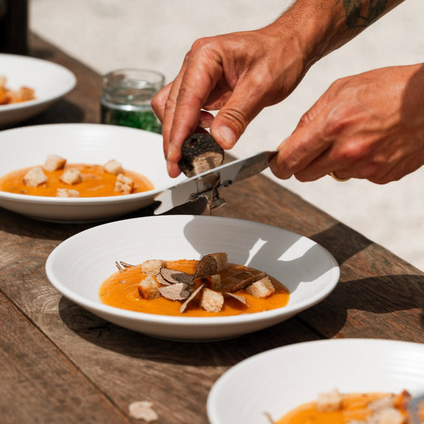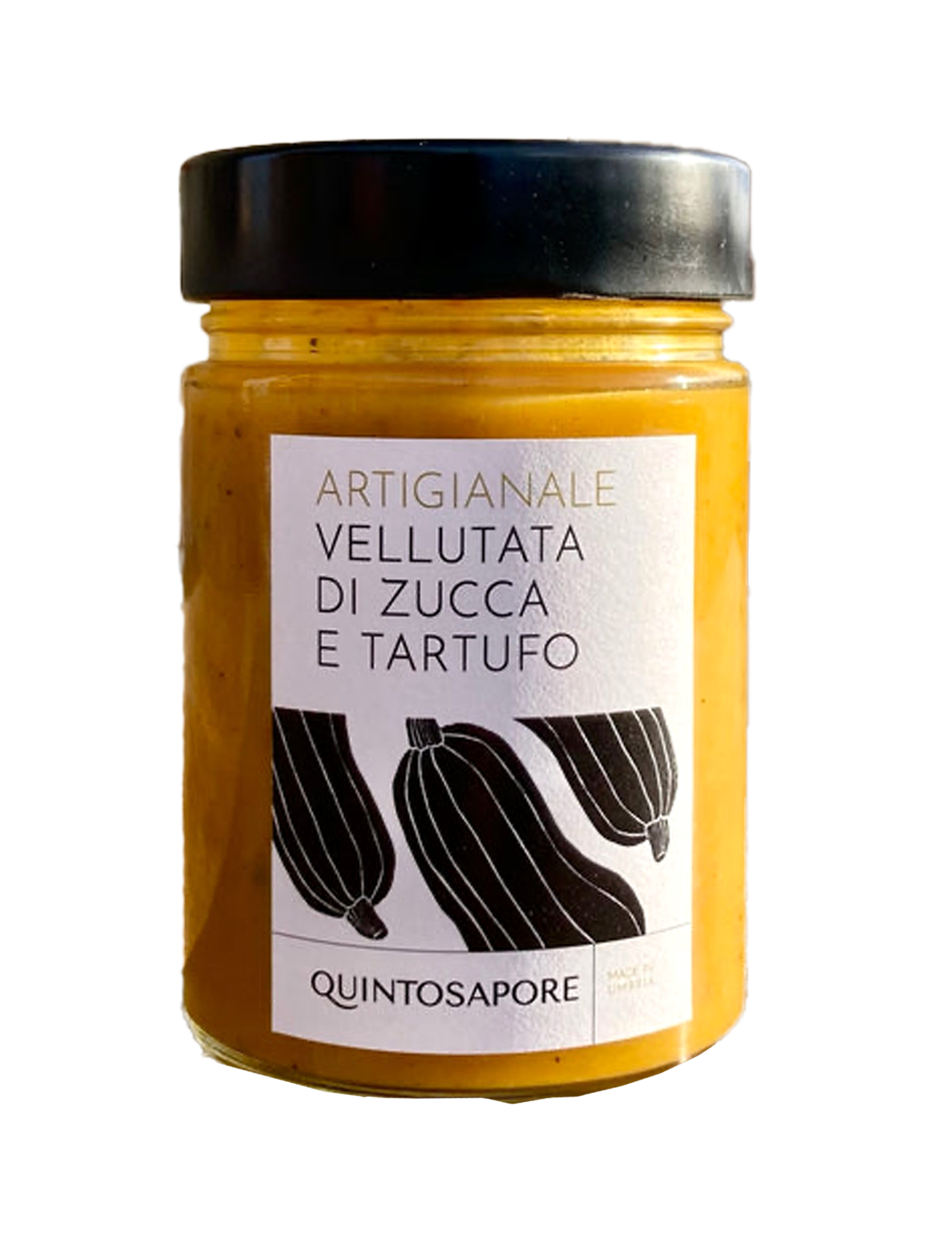 Quintosapore Pumpkin and Black Truffle Soup is a rich, ready-made soup crafted with pumpkins and truffles grown and foraged on the Quintosapore farm—and nothing else. Made with two pumpkin varieties, Lunga di Napoli and Butternut, and fragrant black truffles found by the farm dogs Moka and Bella, this soup captures the true taste of the Umbrian countryside. Founded by twin brothers Ale and Nic Giuggioli, Quintosapore is an innovative farm that follows regenerative, biodynamic, and organic principles to create food that’s both delicious and sustainable. Chef Nic recommends warming it up with a drizzle of extra virgin olive oil and a handful of crunchy croutons for the perfect finish.