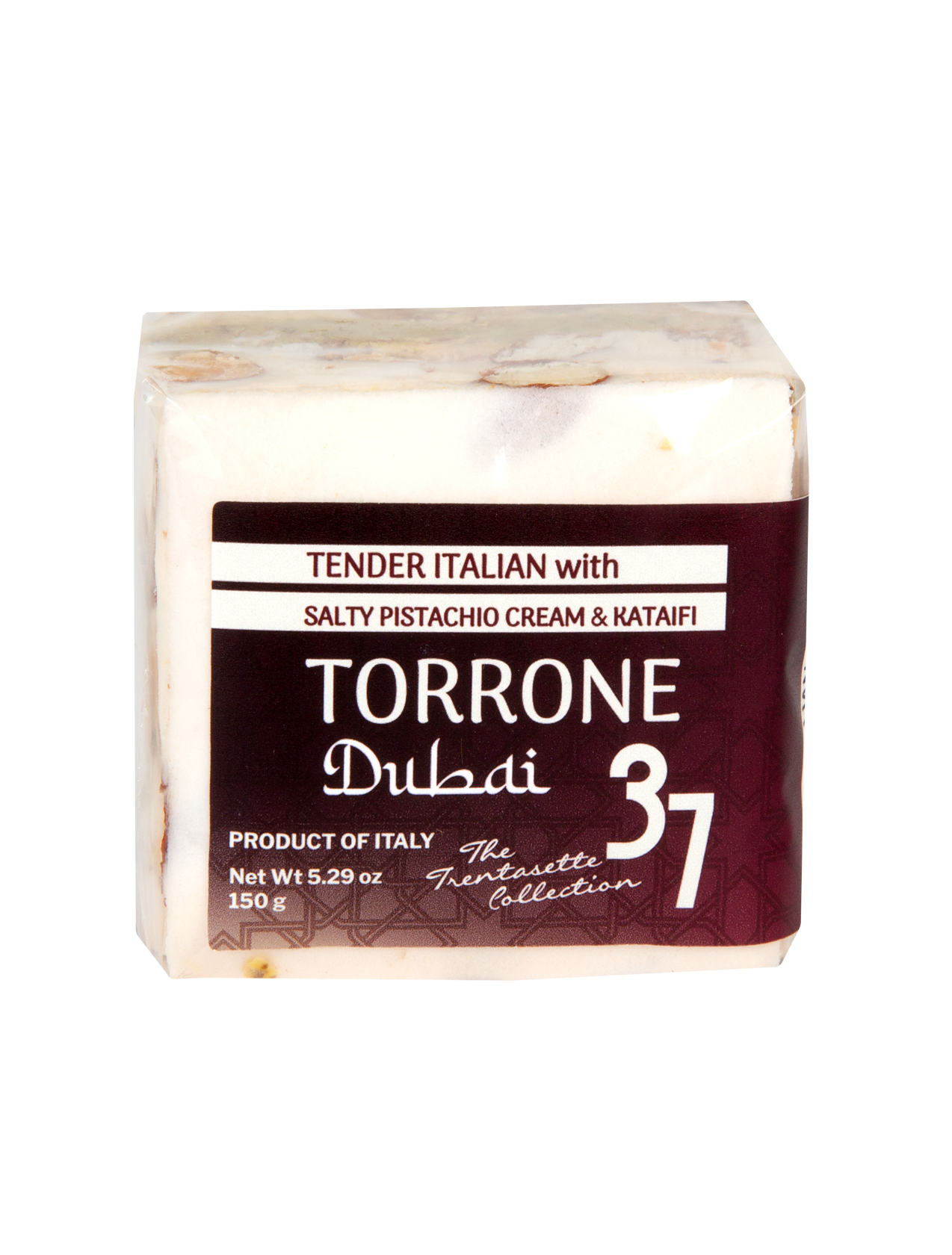 Trentasette’s "Dubai Style" torrone is a soft, chewy nougat made from honey and whipped egg whites, studded with roasted pistachios and swirls of rich chocolate, with a hint of sea salt to enhance the flavors. Each bite is tender and melt-in-your-mouth, highlighting the natural sweetness of the honey and the crunch of the pistachios. This artisanal treat celebrates the tradition of Italian torrone while offering a refined balance of sweet, nutty, and slightly salty flavors. Torrone makes for a unique, wonderful gift!