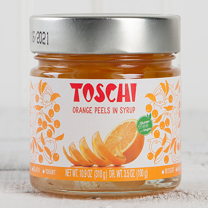 Toschi candied orange peel slices are known for their bright, citrus flavor and delicate bitterness. Preserved in syrup, these candied peels may be used to garnish cakes and desserts. Use them to dress cocktails and drinks or add to any fish, chicken, lamb or duck recipe. They are also gluten free!