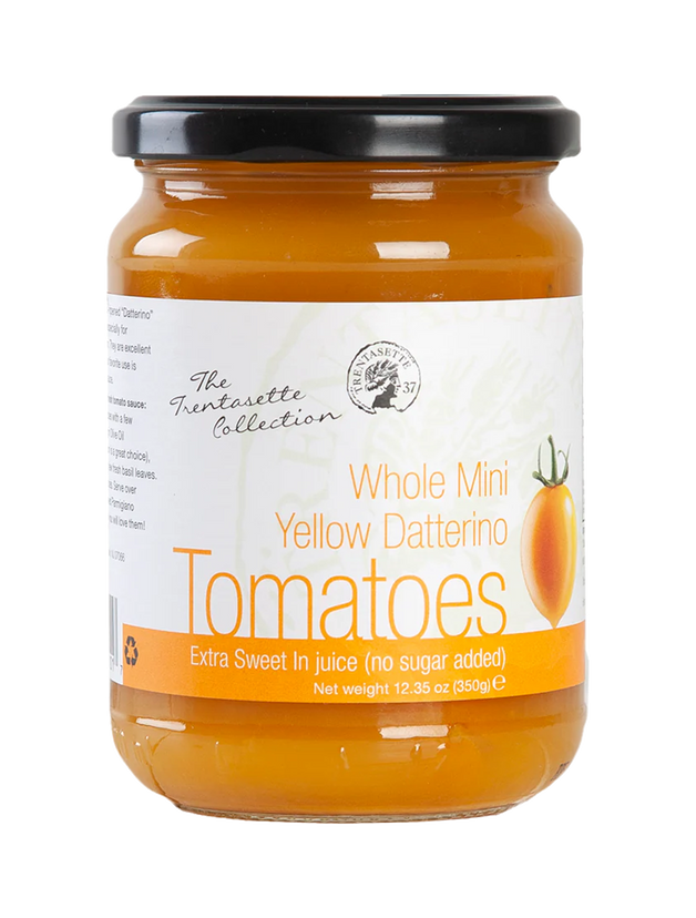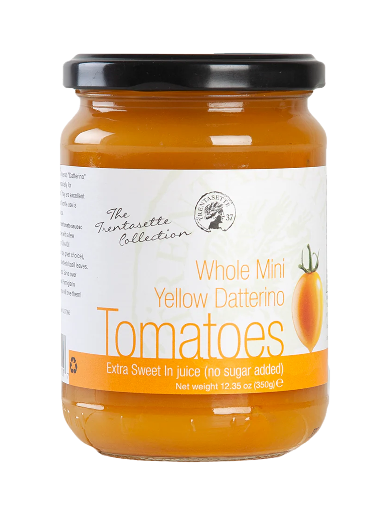 Pure, sun-ripened, yellow "Datterino" tomatoes are hand selected for the Trentasette collection. Free of additives, colorings and artificial ingredients, these tomatoes are fresh-picked by hand and bottled naturally in their own juice. Selected as a finalist for the 2014 sofi awards at the Fancy Food Show.